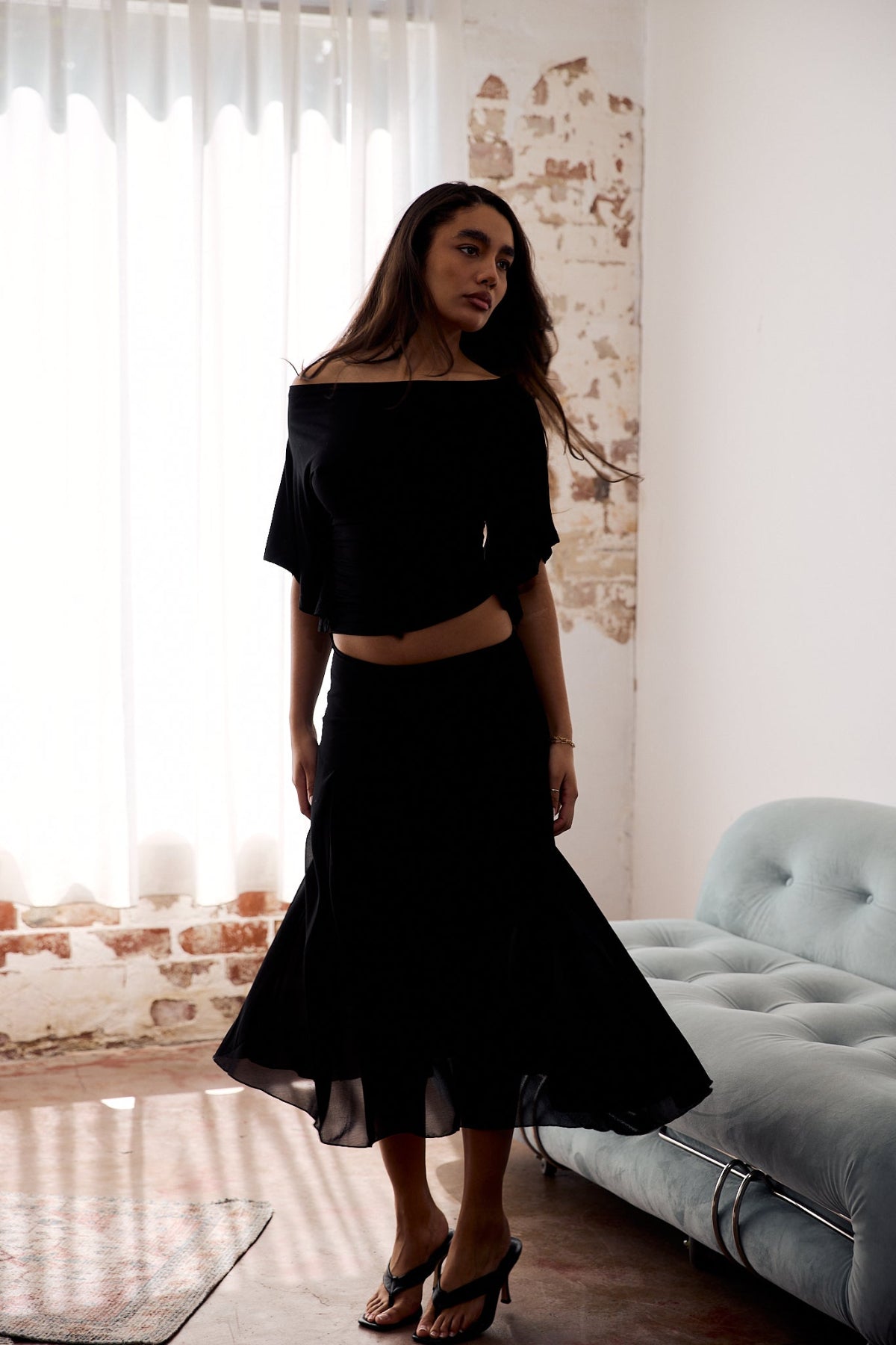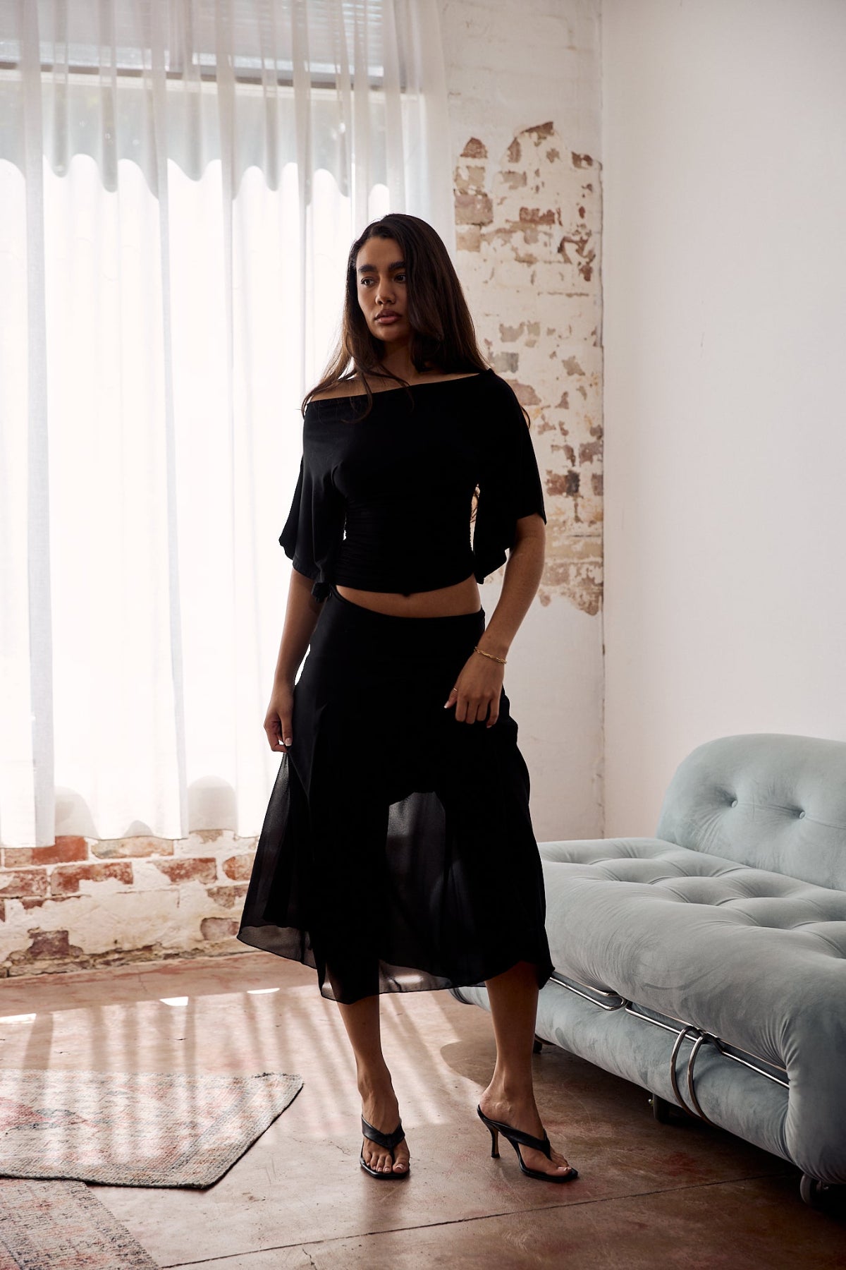 The Amara Skirt is cut from a lightweight chiffon that drapes softly over the body, finished with a subtle flare for natural movement. Designed to sit mid-rise and lined for ease.