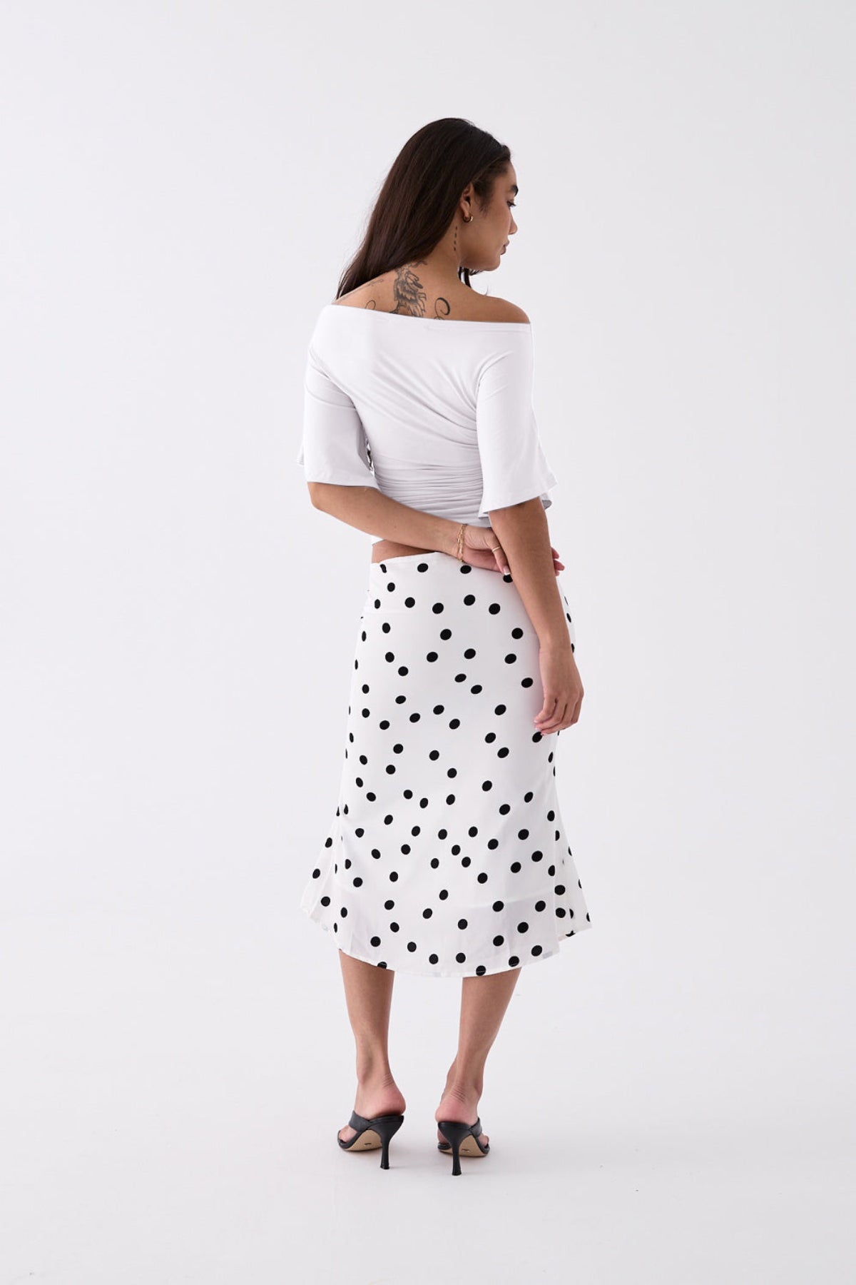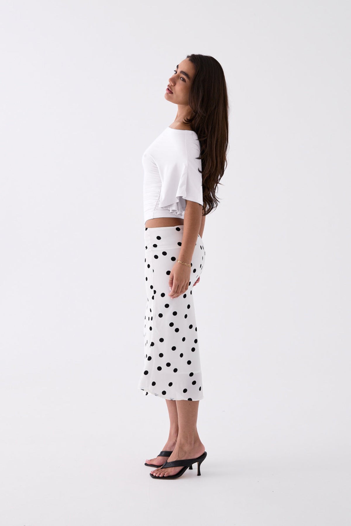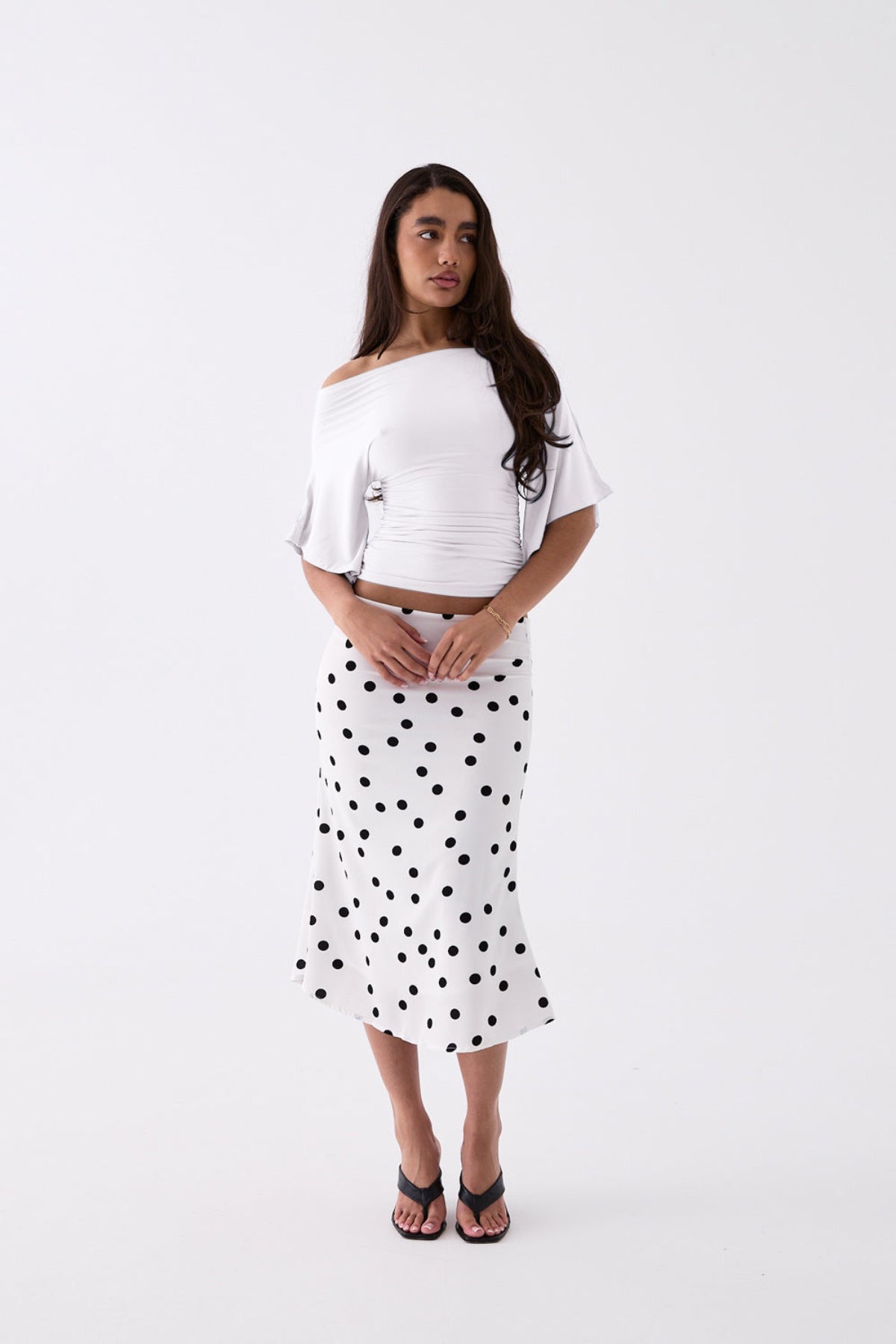The Aria Top features a wide neckline, soft flutter sleeves, and subtle ruching through the waist for a flattering, form-skimming fit.