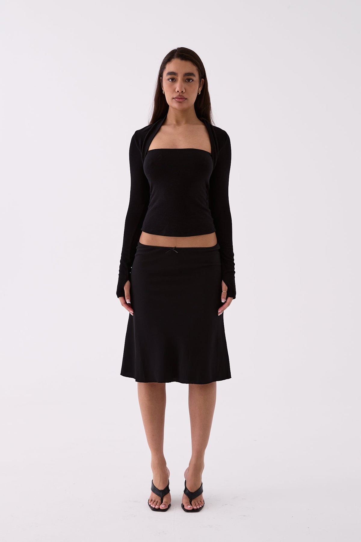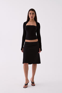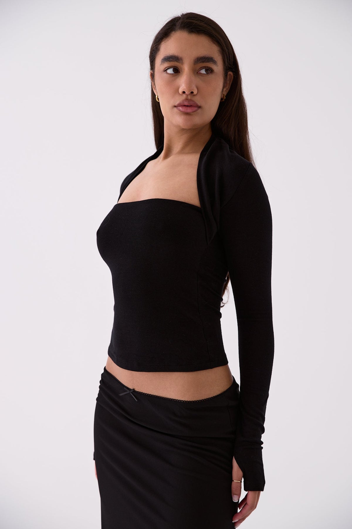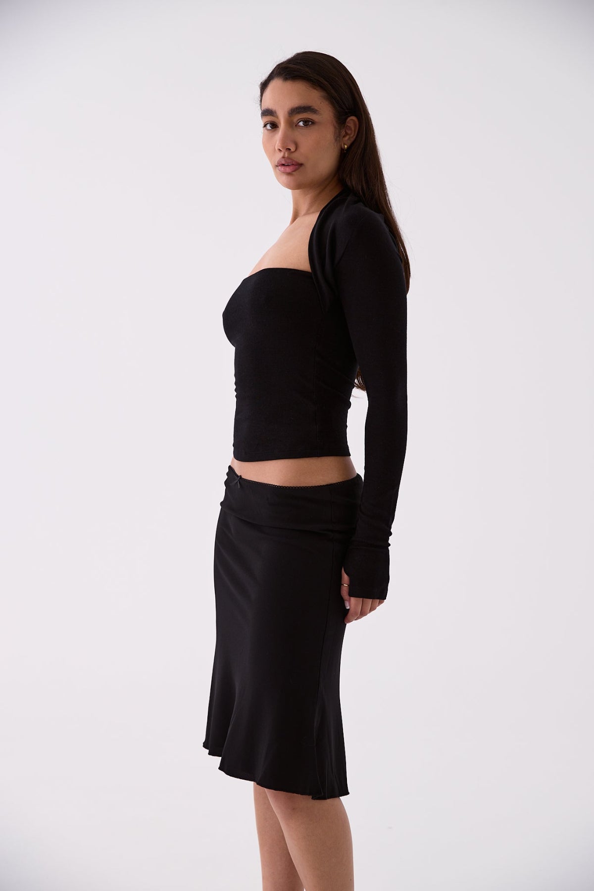 The Aven Top features a fitted bandeau-style bodice paired with an attached shrug sleeve for a refined, contemporary silhouette. Crafted from a soft stretch fabrication, it’s the perfect balance of minimal and bold.