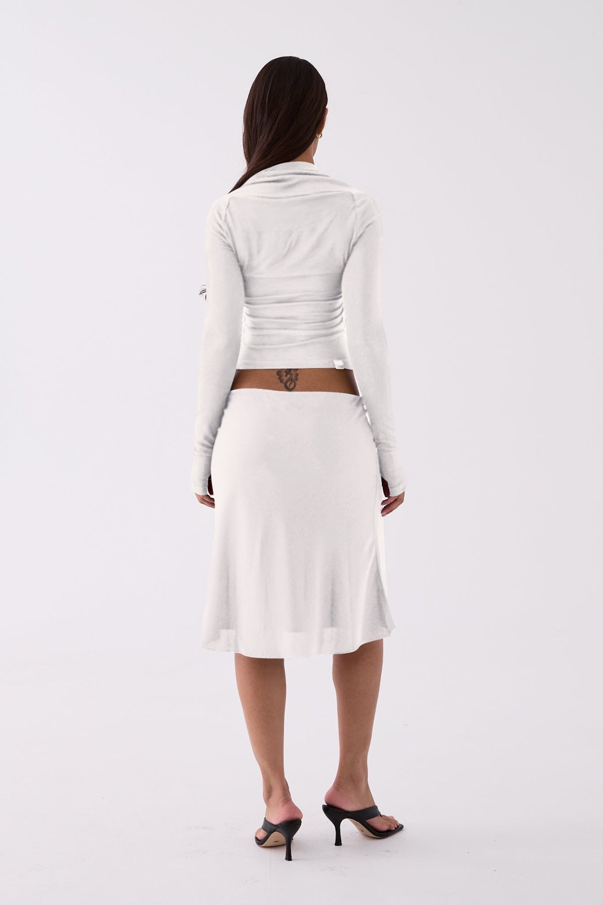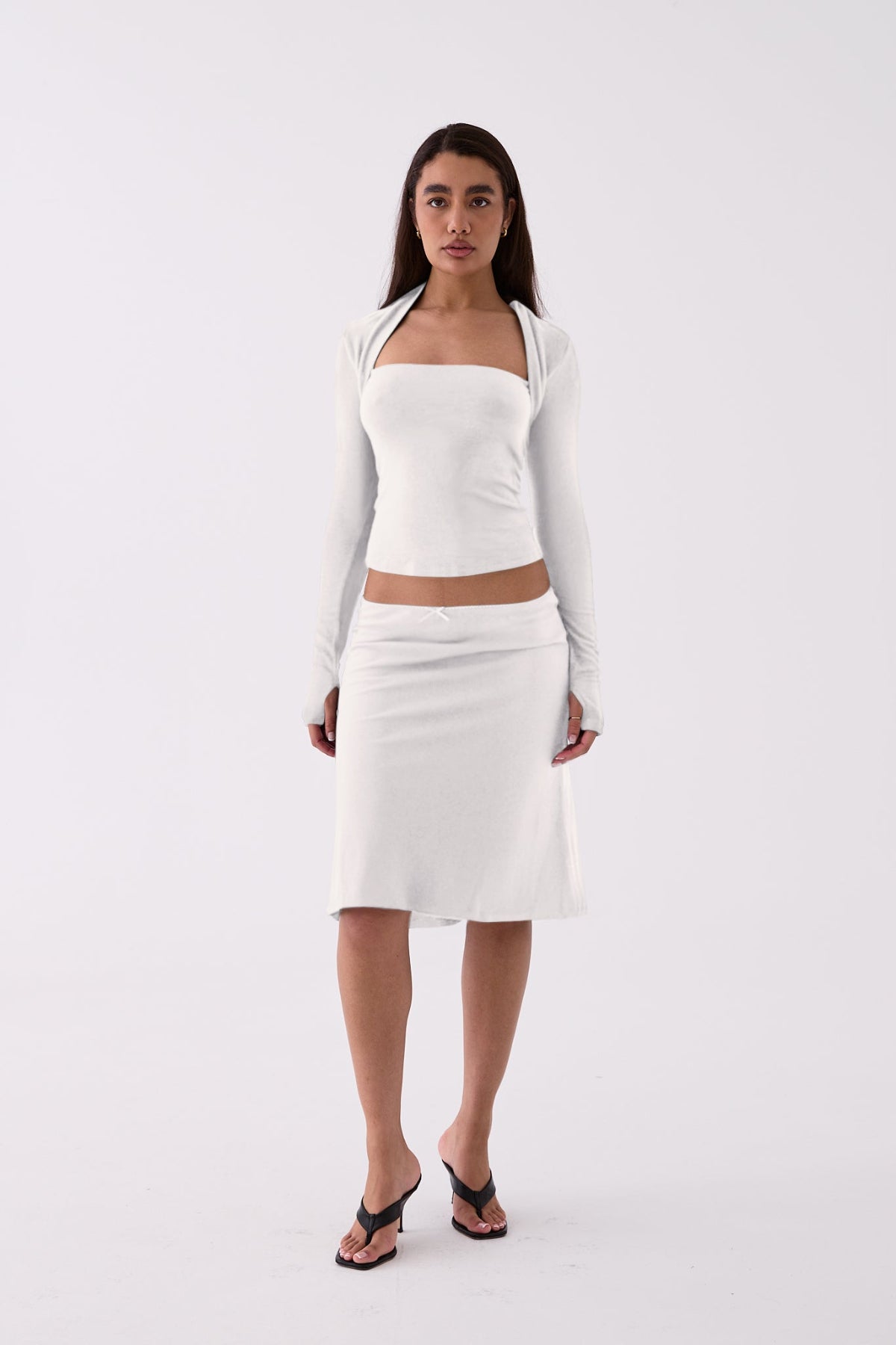 The Aven Top features a fitted bandeau-style bodice paired with an attached shrug sleeve for a refined, contemporary silhouette. Crafted from a soft stretch fabrication, it’s the perfect balance of minimal and bold.