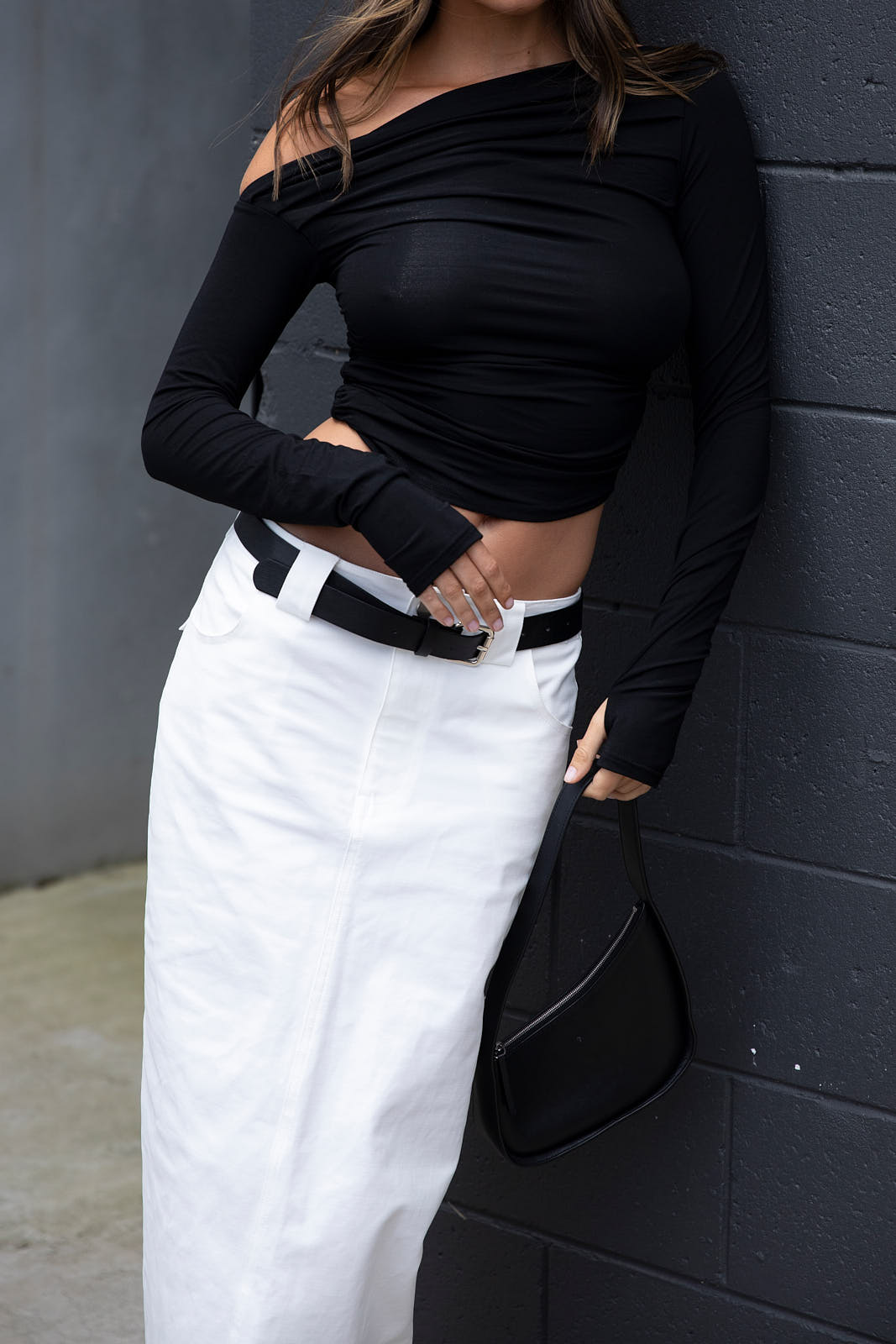 Featuring ruche side body detailing, the Bella Ruche off The Shoulder Top - Black has a slightly cropped length