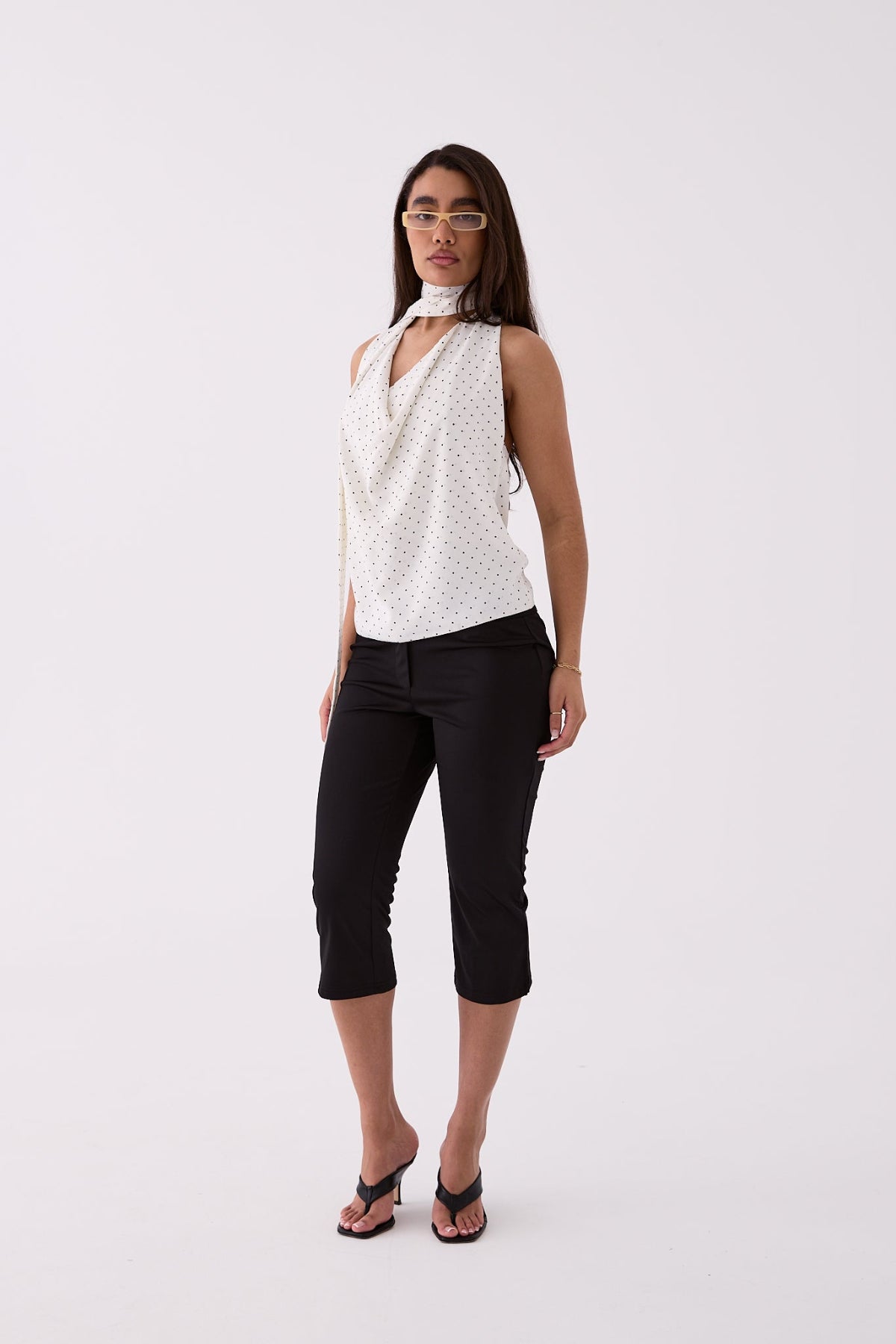 The Camilla Scarf Top features a soft draped neckline, halter-style cut, and a removable scarf tie for versatile styling. Designed in a lightweight crepe with a subtle spot print