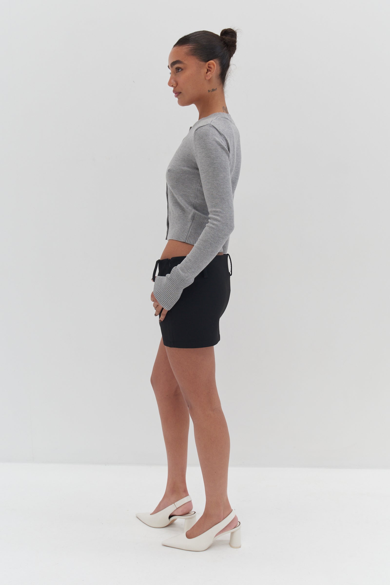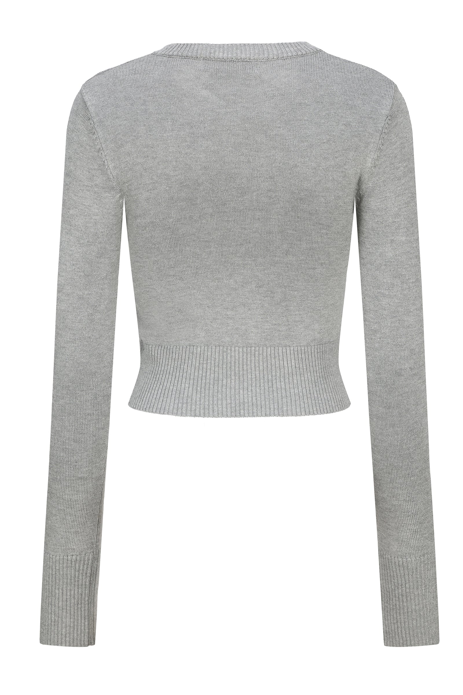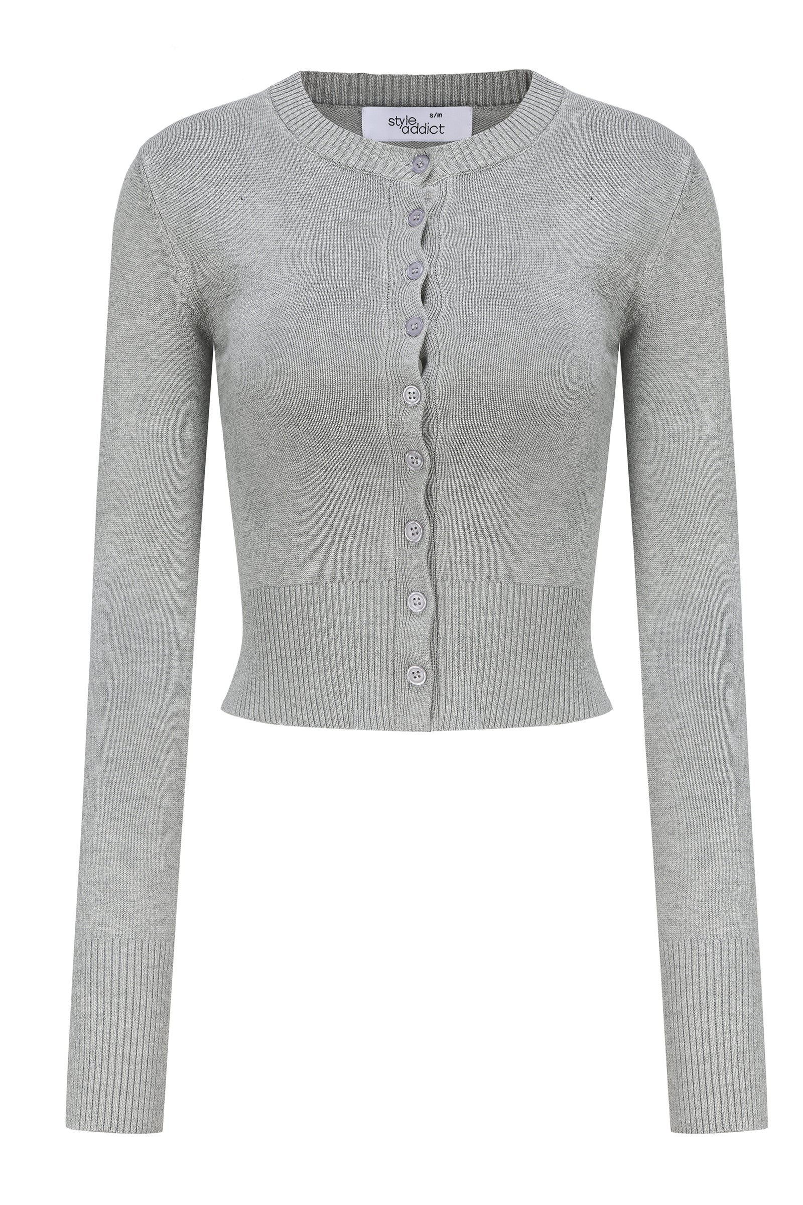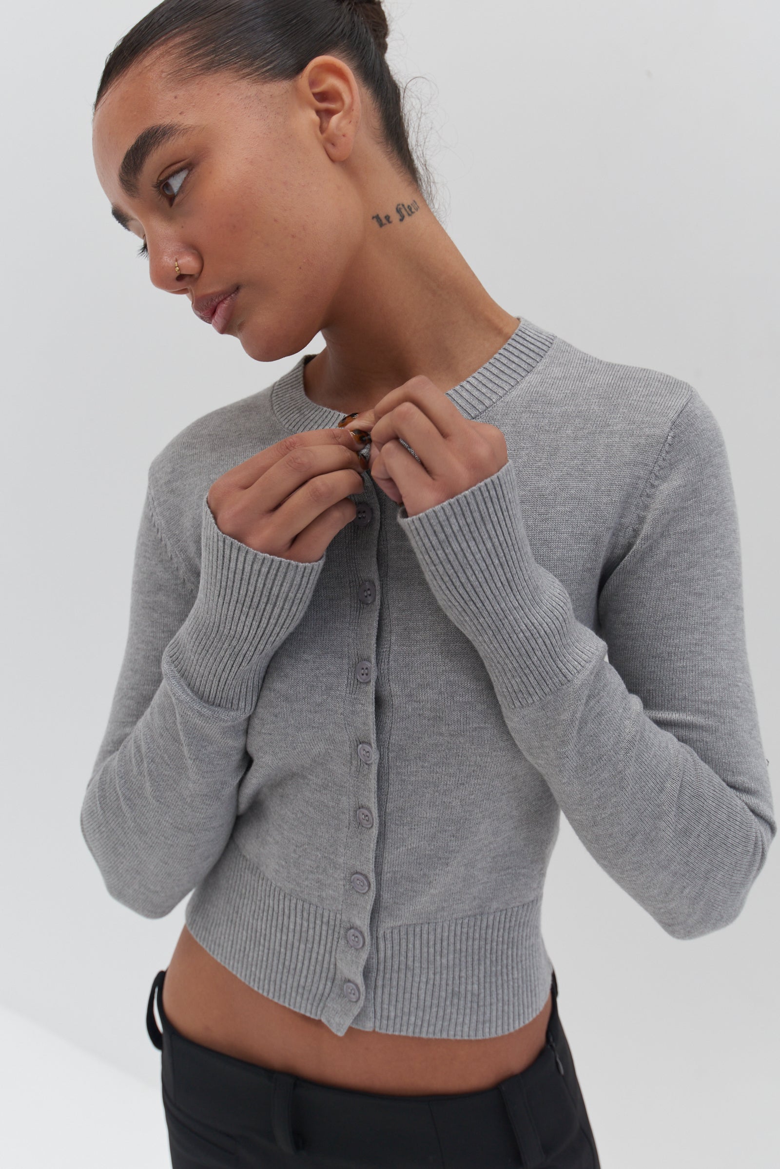 A cozy wardrobe essential. Our Camille Cardigan - Grey is crafted from a soft grey knit; featuring - a classic button-up front, slightly cropped length and finished with ribbed detailing to the hem, cuffs and neckline