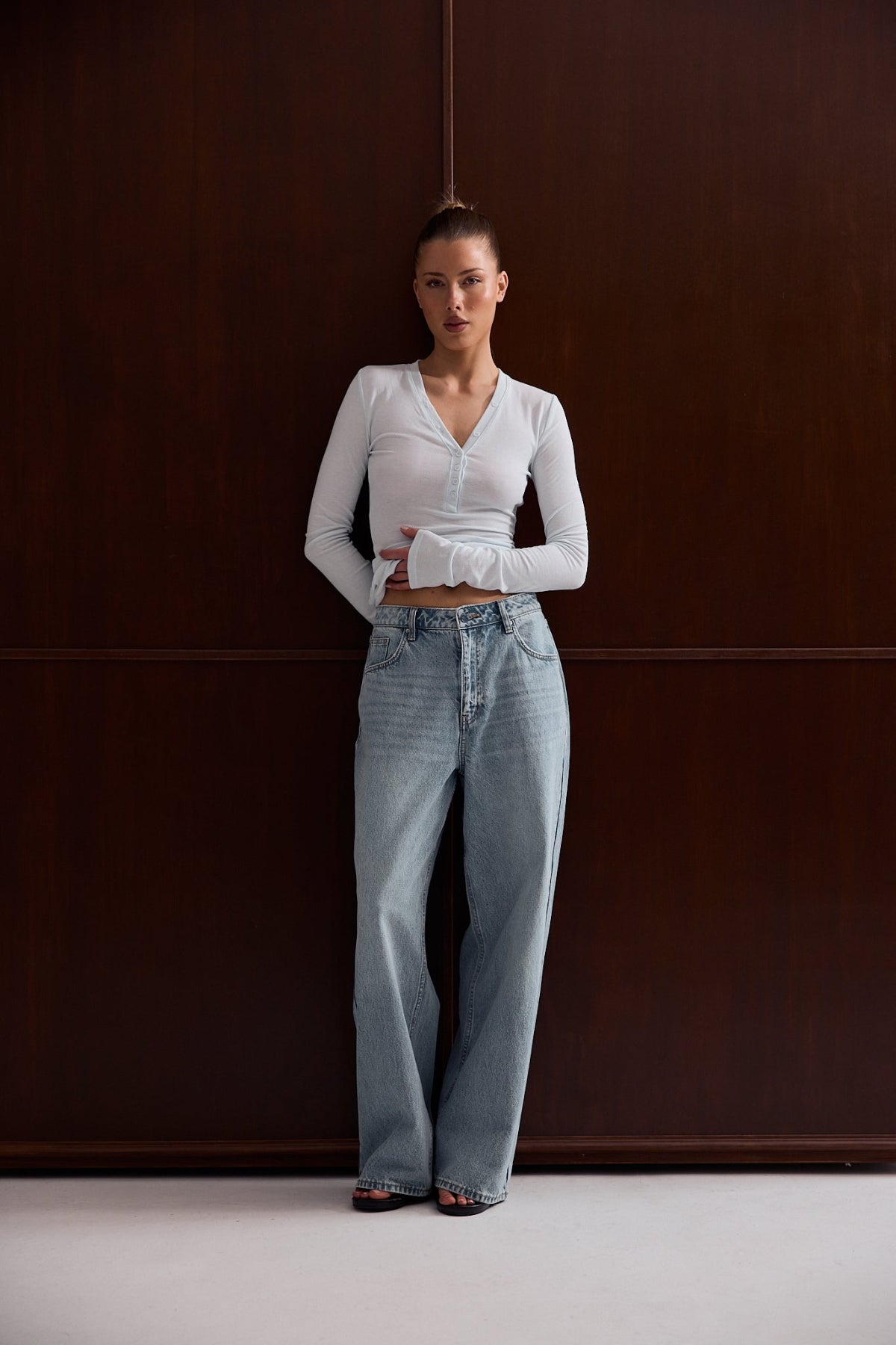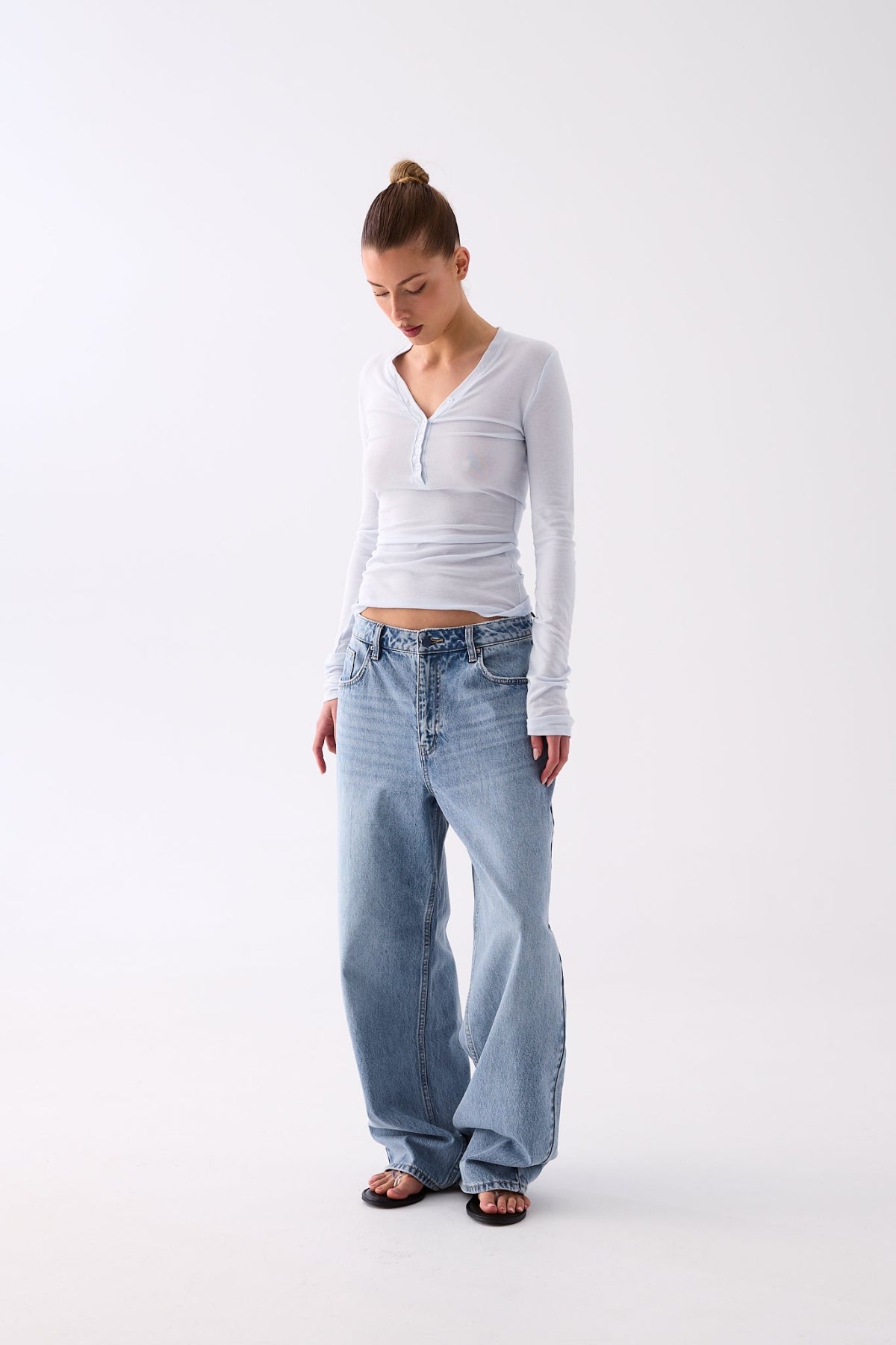 - Deep V neckline with button placket