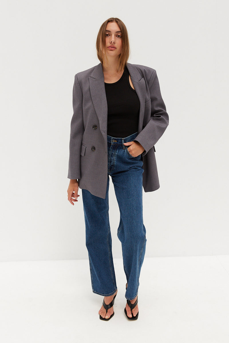 A classic straight leg jean with a high waist and button fly