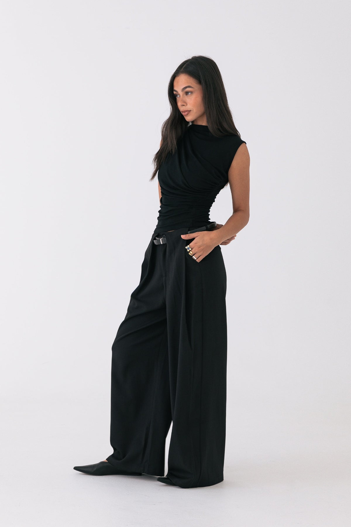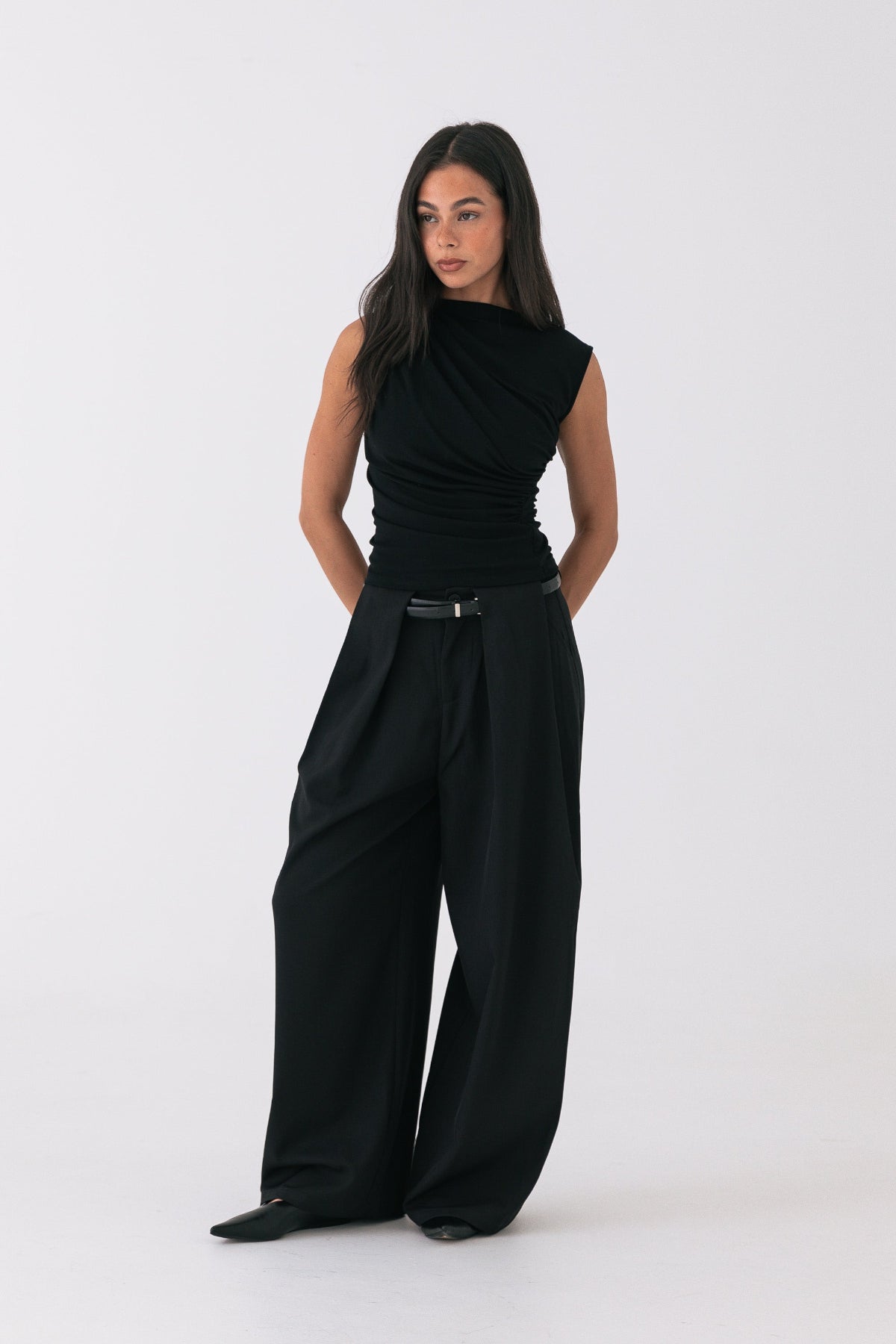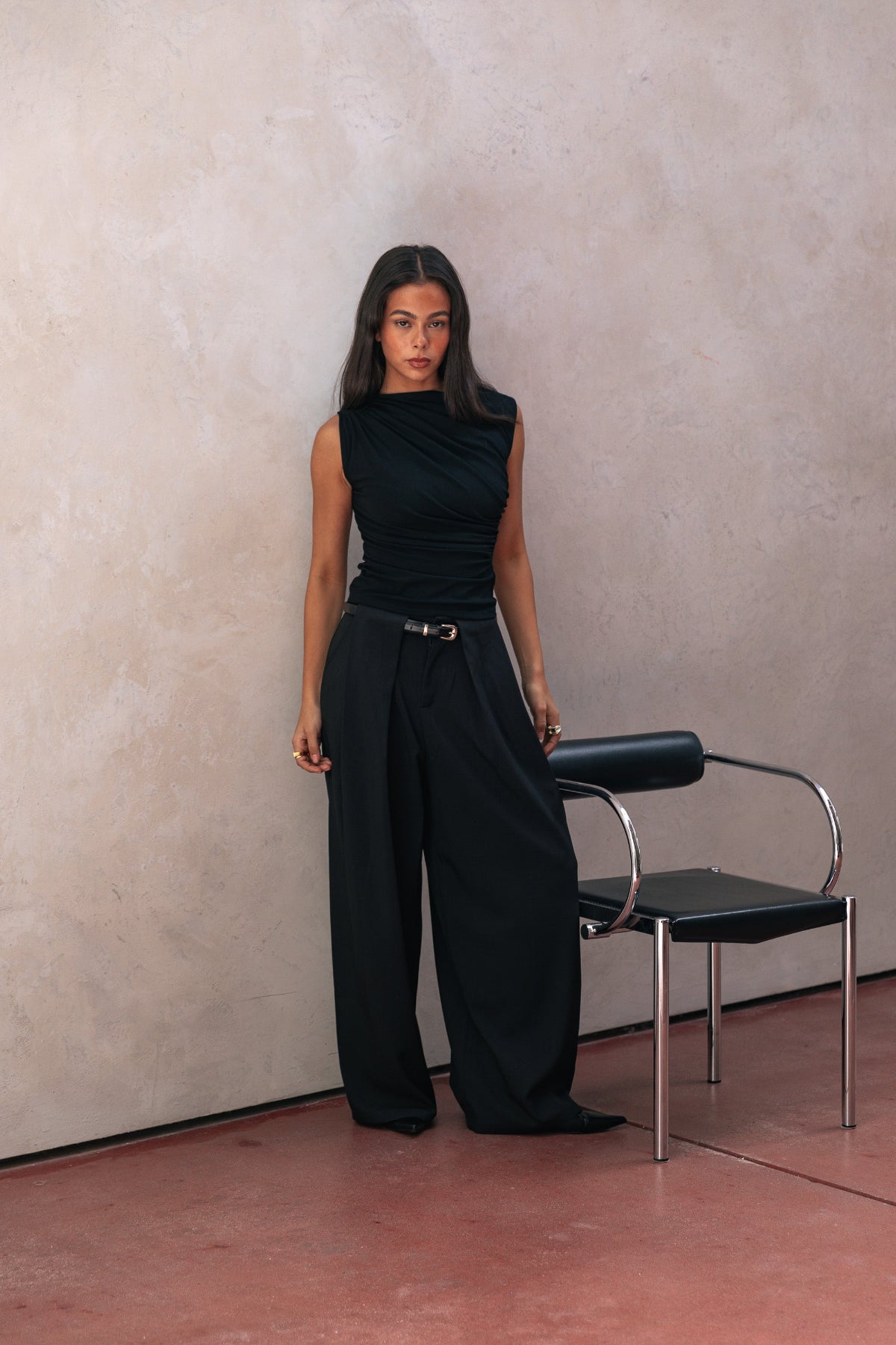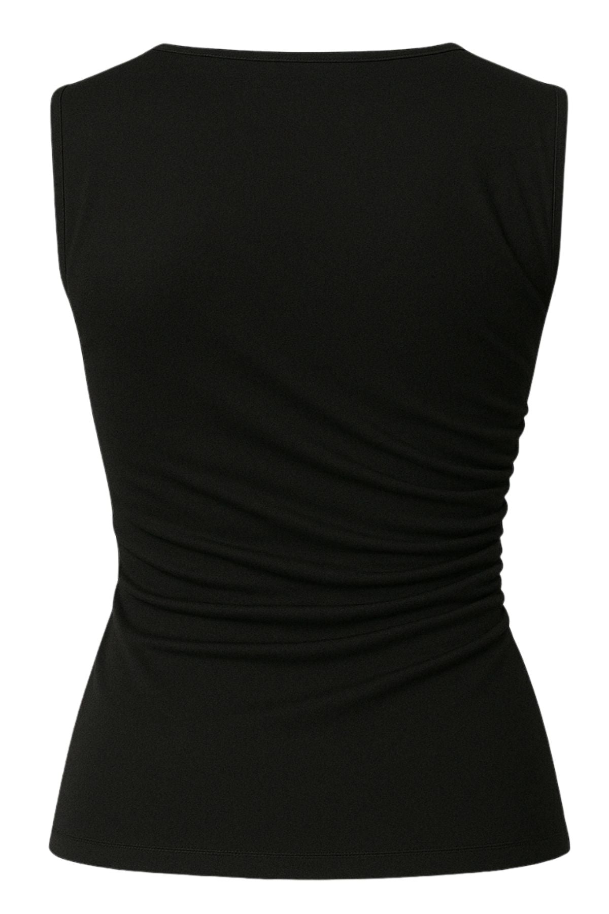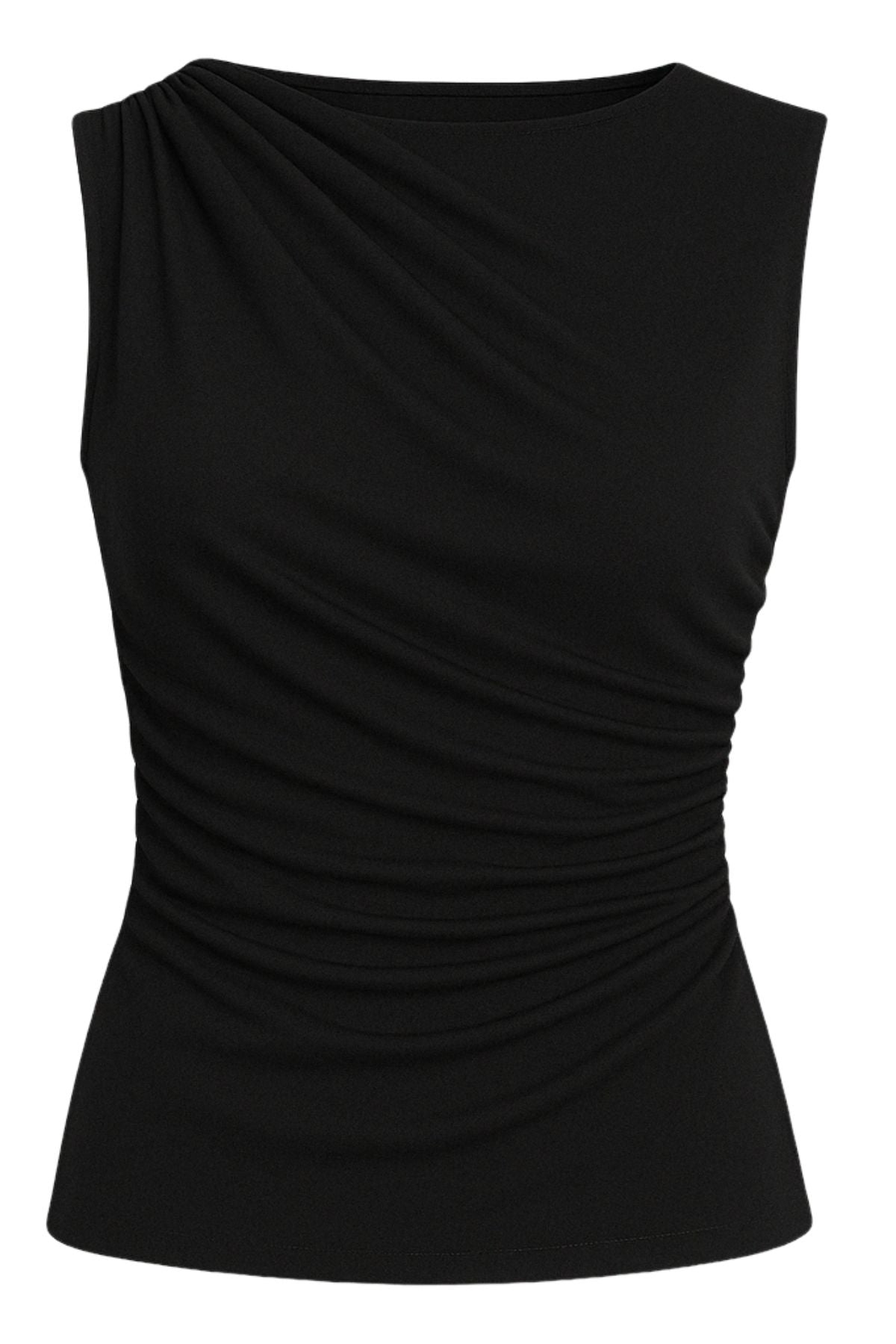 Soft, sculptural, and easy to style. This asymmetric tank features a gathered shoulder and ruched side detailing, creating a fluid drape across the body. Made in a lightweight stretch jersey that moves with you—wear it tucked into denim or paired with tailored pants.
