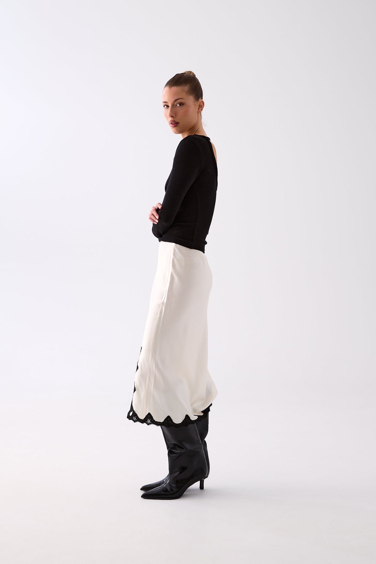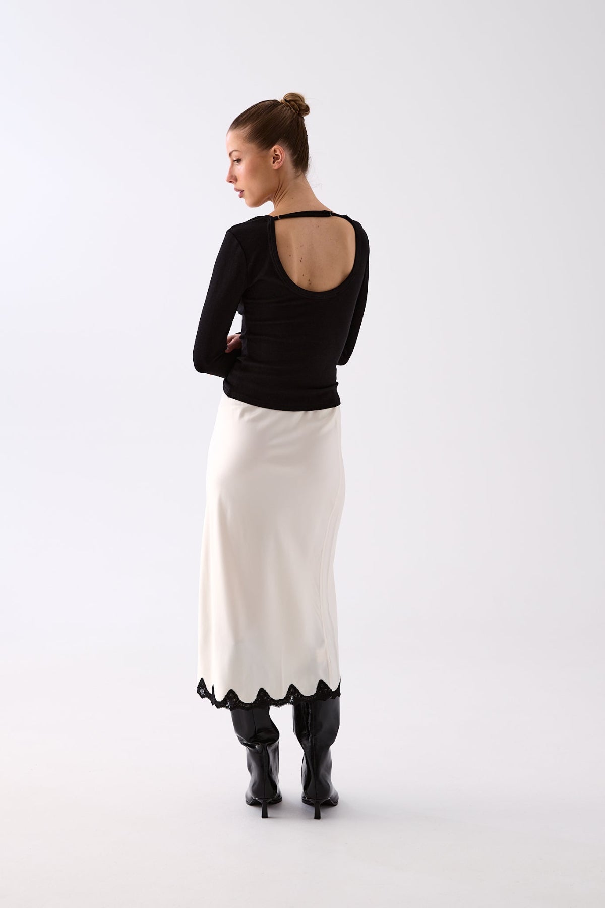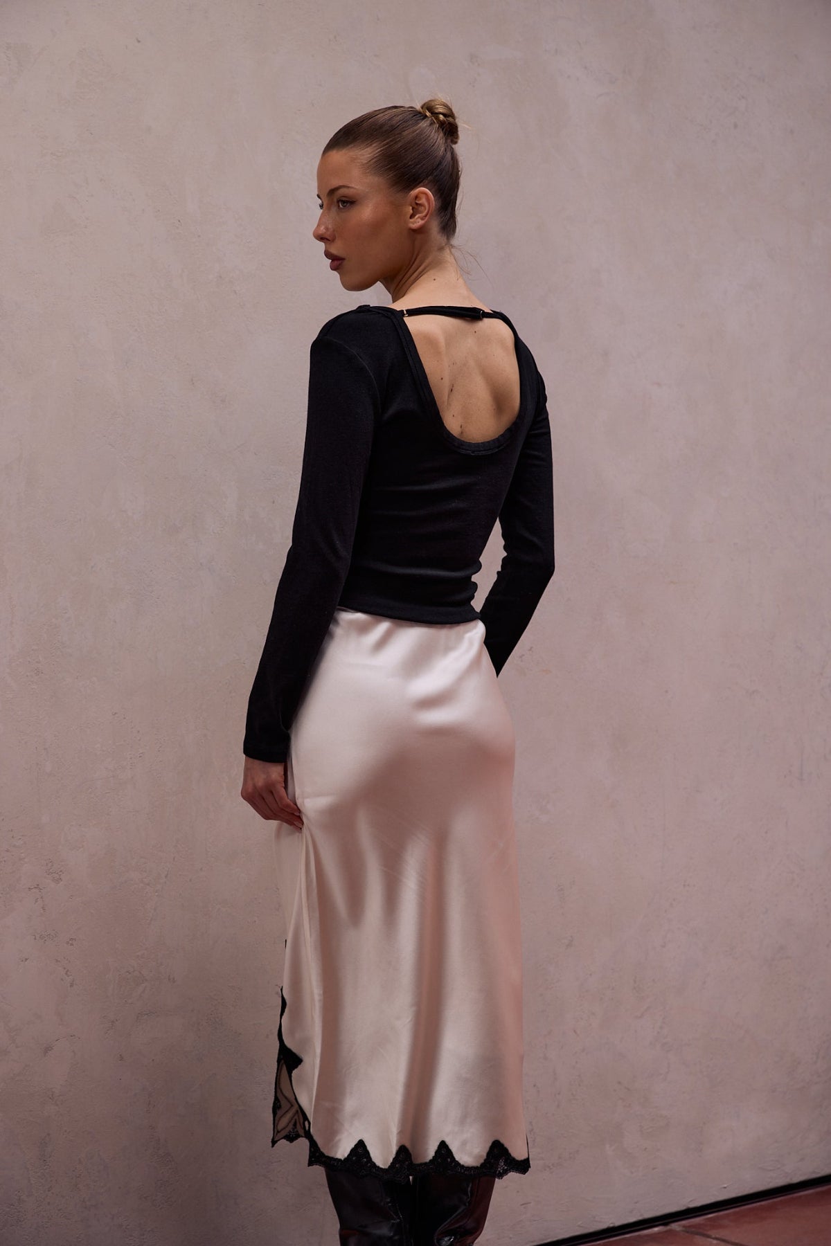 Made from a soft stretch knit, it features a clean front and a deep scoop-back silhouette with a fine adjustable strap detail. Designed to pair effortlessly with slip skirts, denim, and tailored layers.