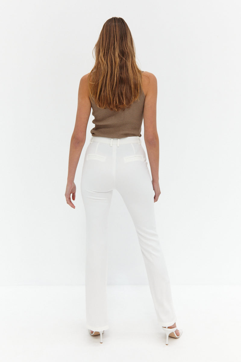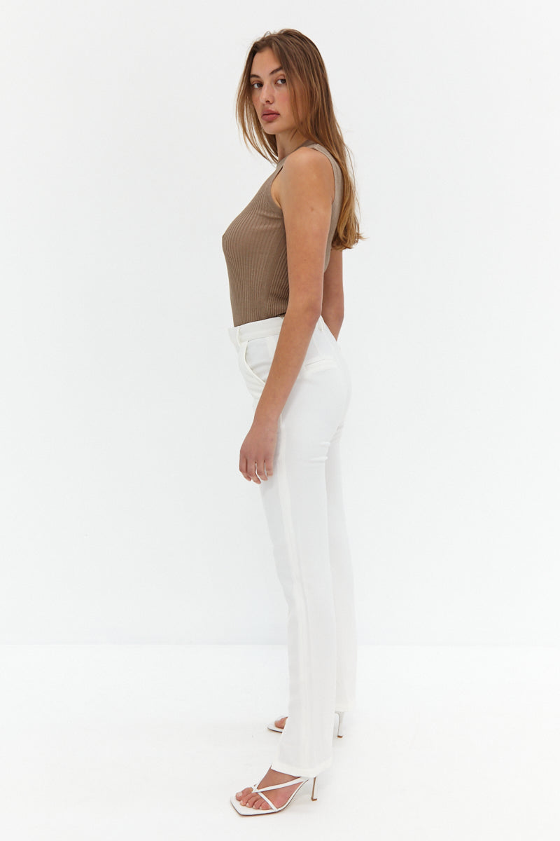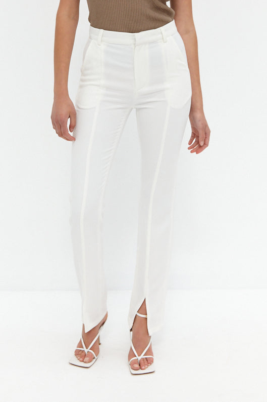 The Front Split Trouser Pants features a high waist, front leg seam detail which leads into slits that sit just above the ankle, with zip fly and concealed hook closure. They work well with sneakers during the day to heels at night. Worn here with: Charlotte Top.
