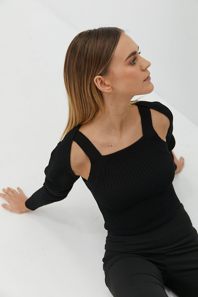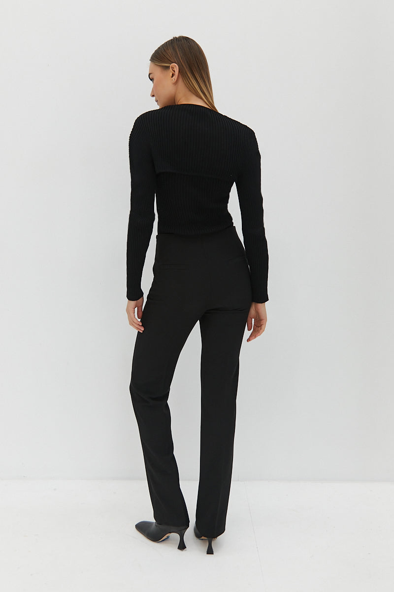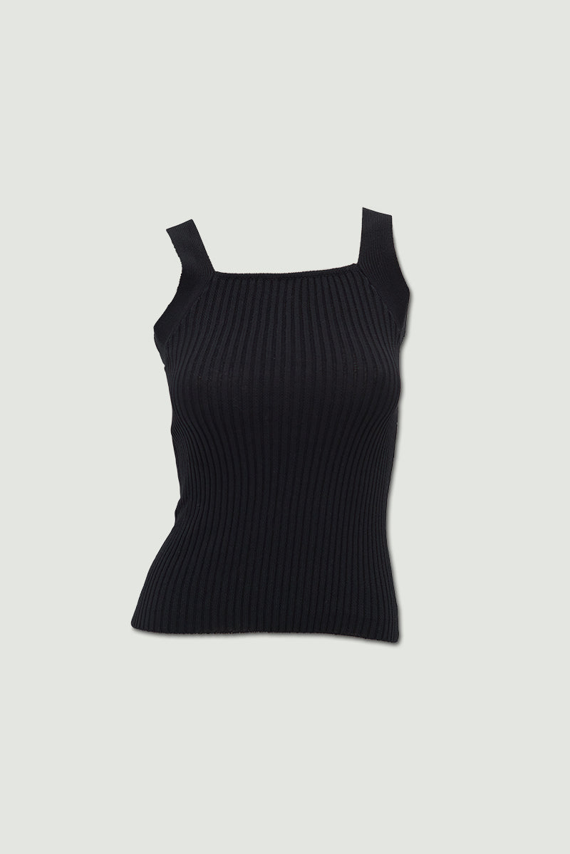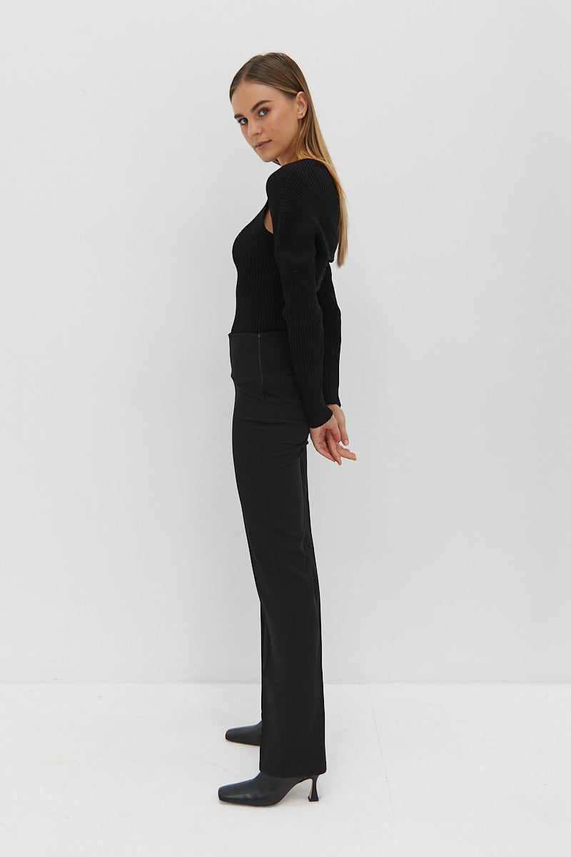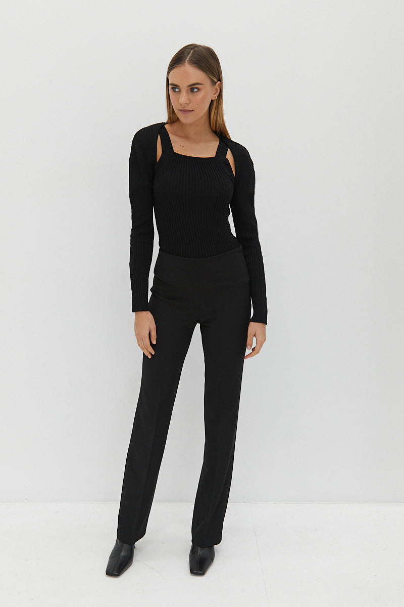 The Julianne Knit Tank - Black is a thick knit tank with contrasting flat knitted thick straps. Worn here with the Julianne Knit Bolero & Rachel Trousers