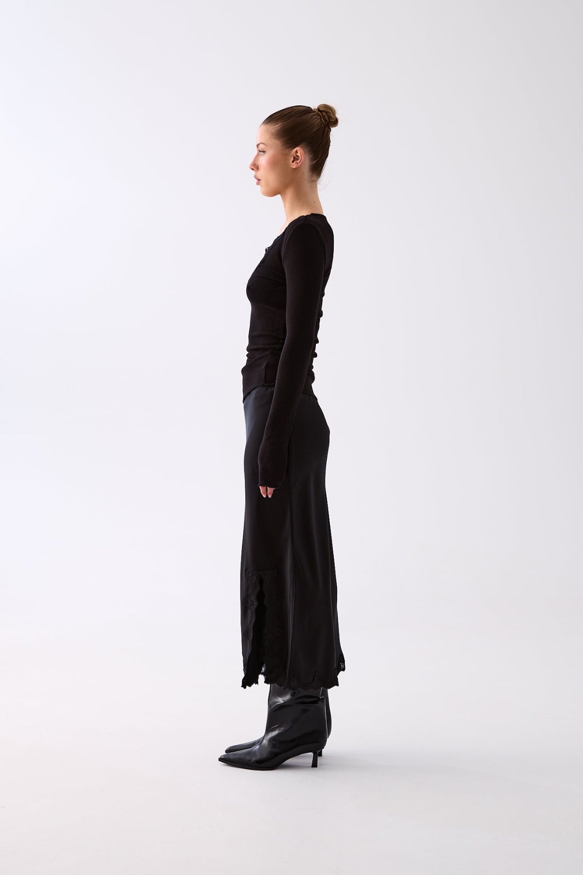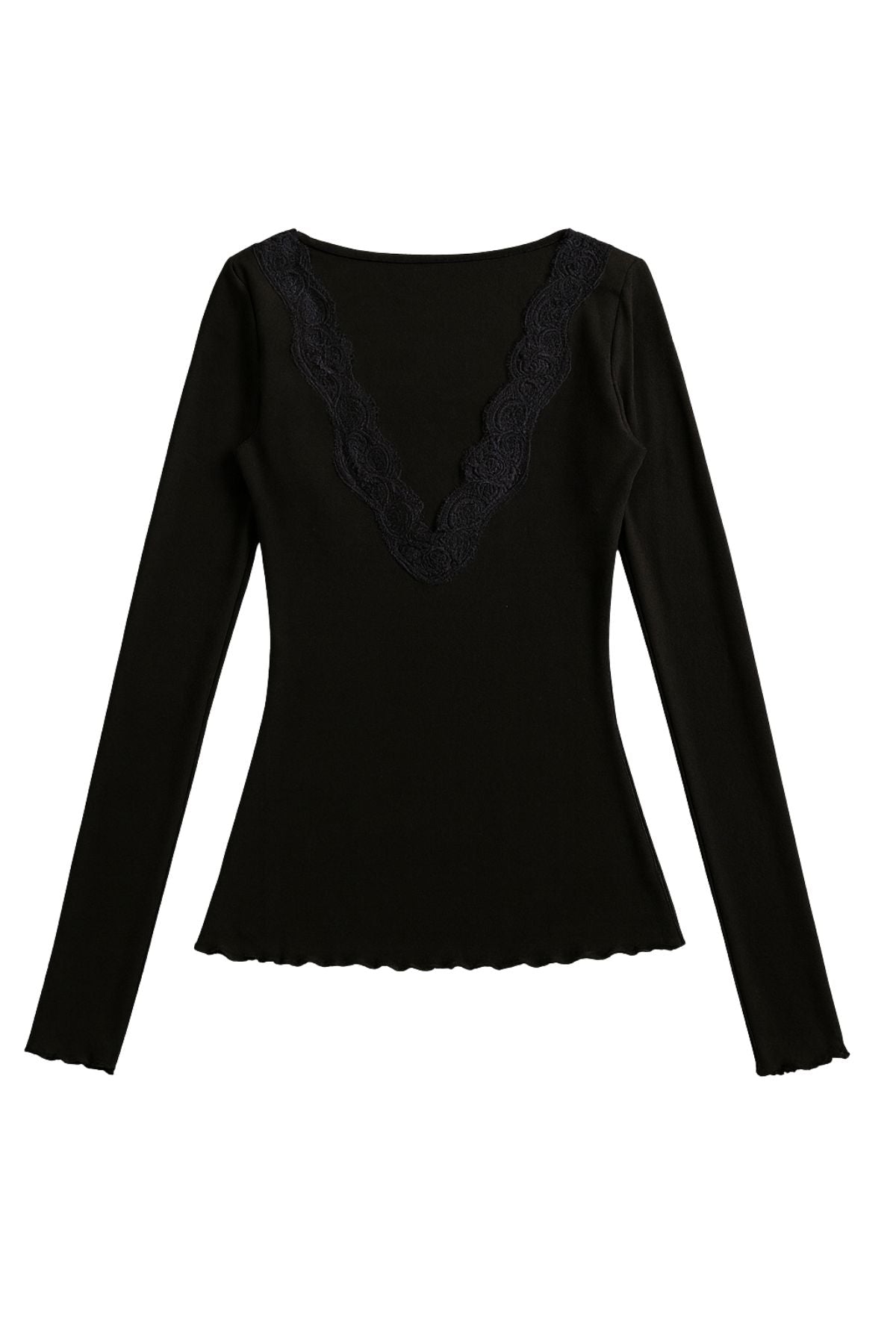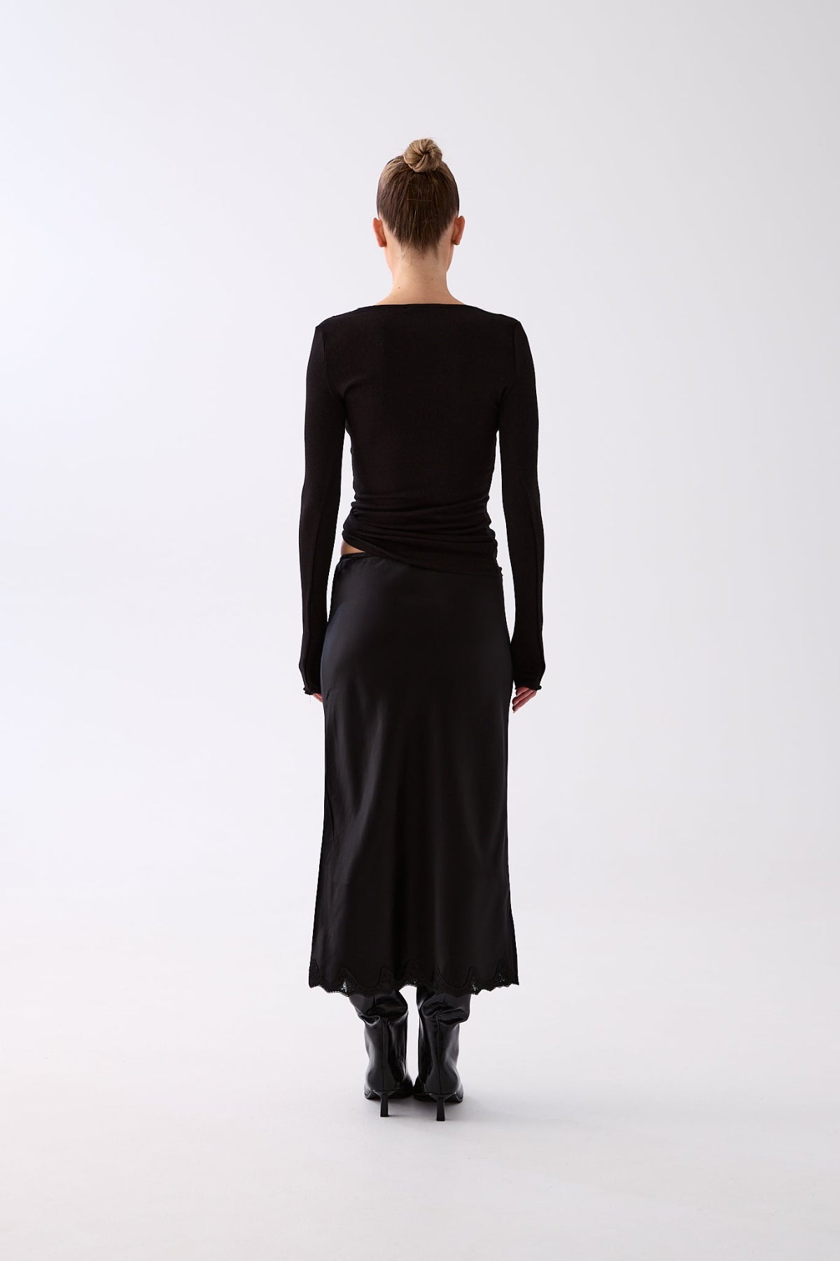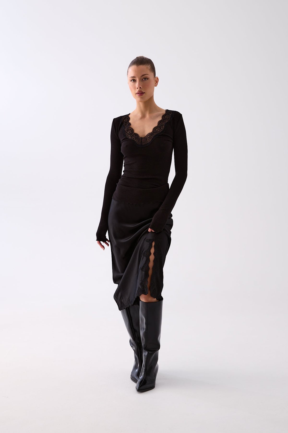 The Lia Lace Trim Long Sleeve Top is crafted from a soft, body-skimming knit and framed with a delicate scalloped lace neckline that adds subtle femininity to an otherwise minimal silhouette. Designed to dress up or pare back, it layers seamlessly with slip skirts, tailored trousers, or denim.