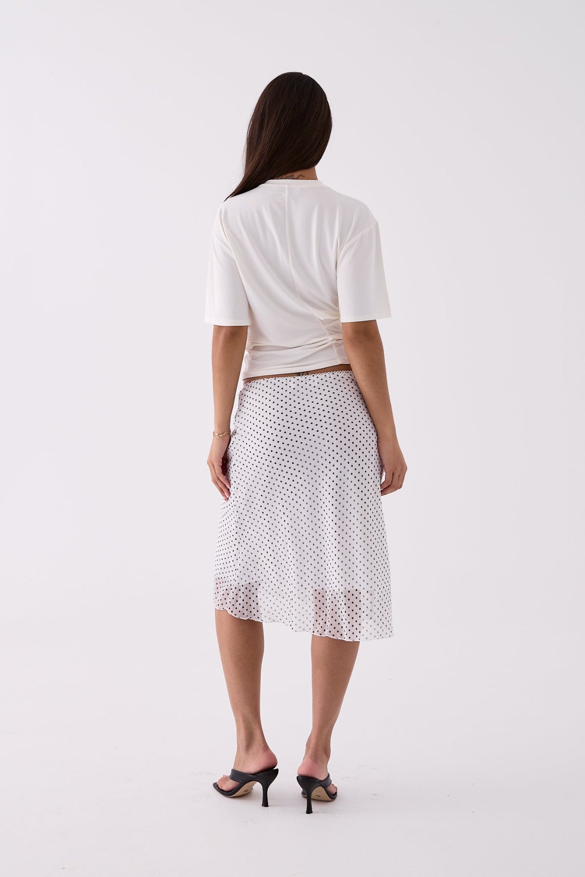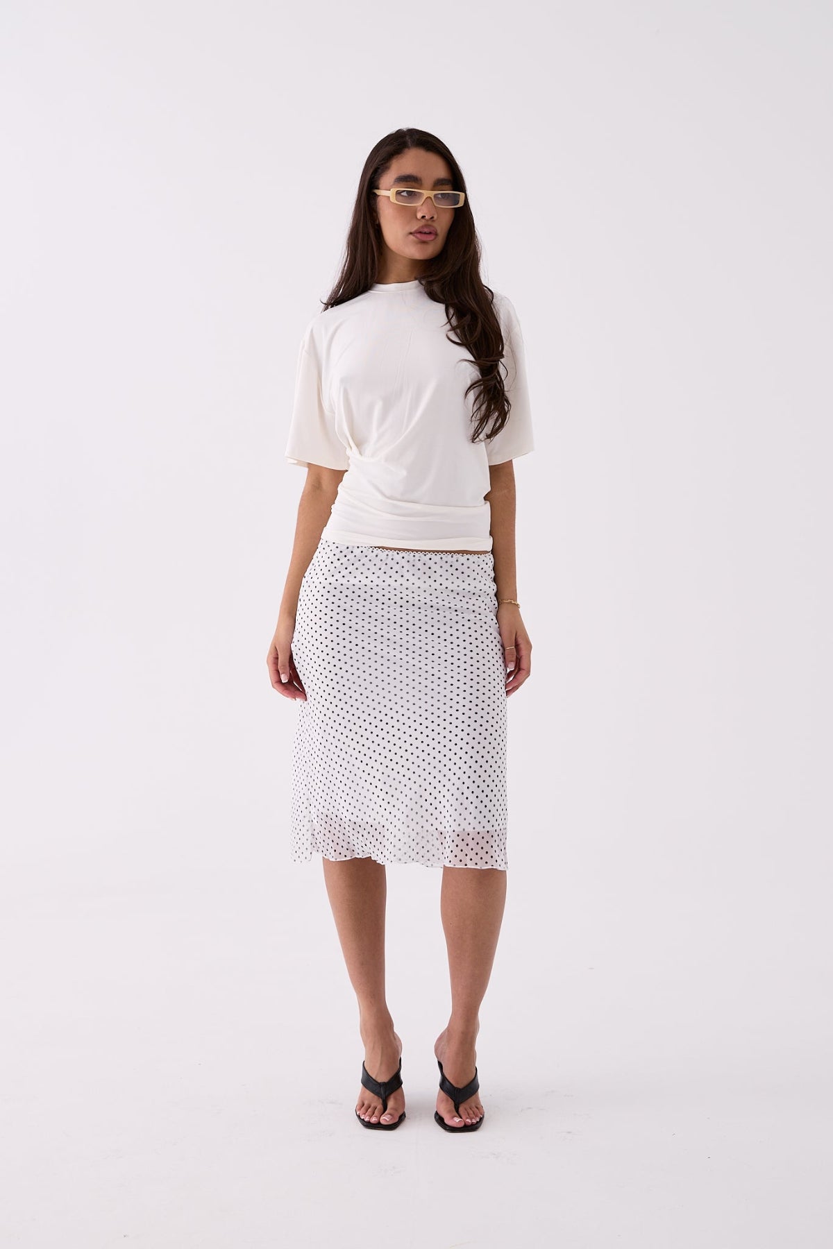 An understated essential with soft structure. The Lira Top features a high neckline, relaxed drape through the body, and subtle gathered detailing at the waist for a flattering finish. Crafted from a smooth stretch fabrication, the perfect base for day-to-night styling.