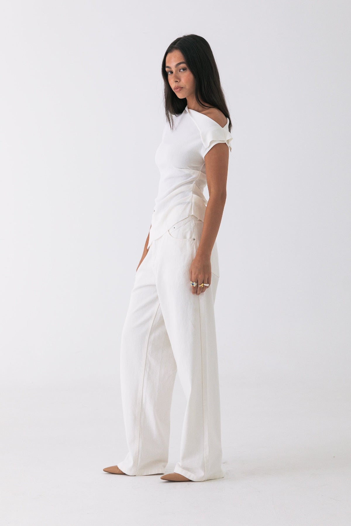 An elevated essential. The Nico Tee features a clean asymmetric neckline and soft drape through the body, cut from a lightweight stretch jersey. Designed to skim the waist with a fluid fit—style it with trousers, denim, or layered under a blazer.