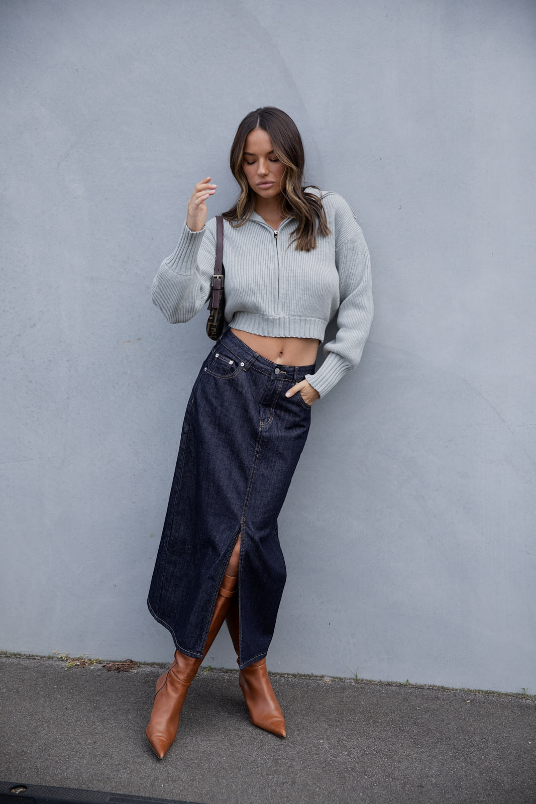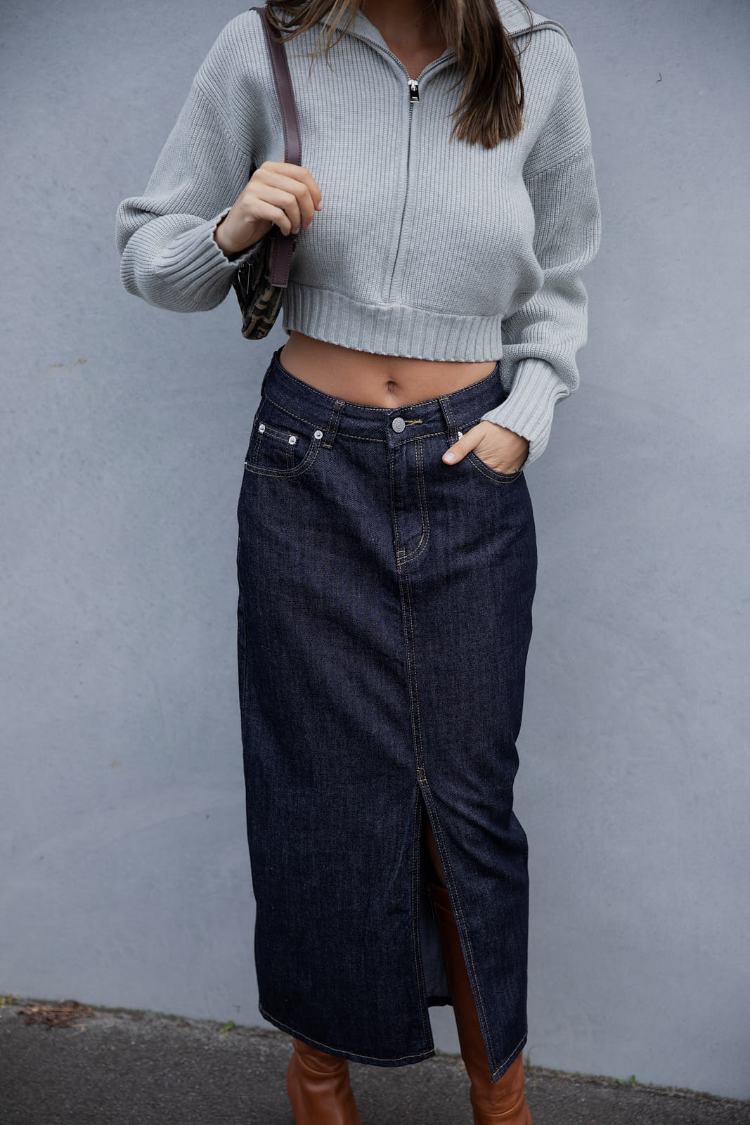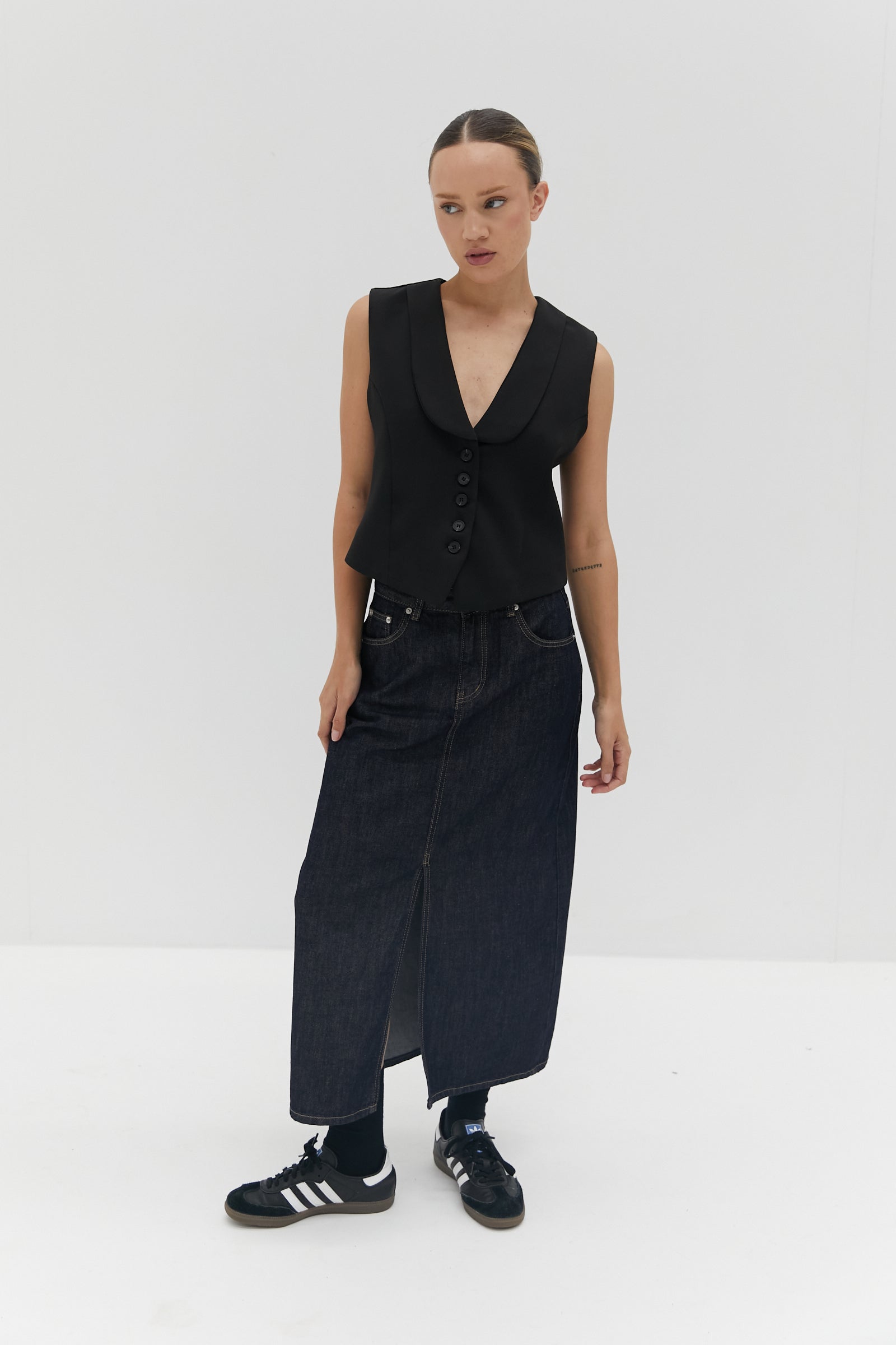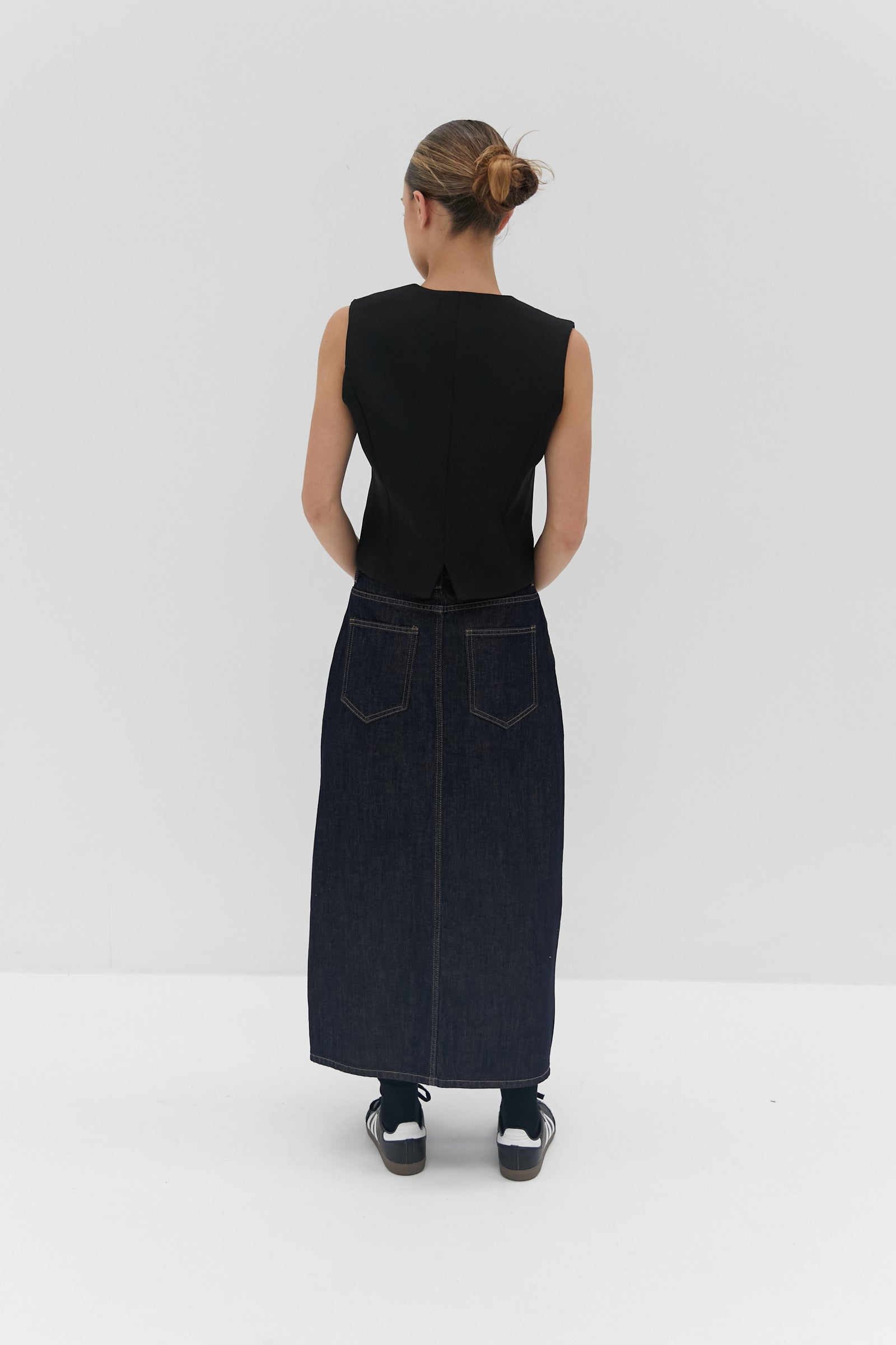 The Nikki Denim Midi Skirt - Dark Denim offers a versatile look across the seasons. Made from a comfortable cotton denim fabric, this mid-high waisted skirt features side and back pockets, belt loops, button front closure and a front split detail