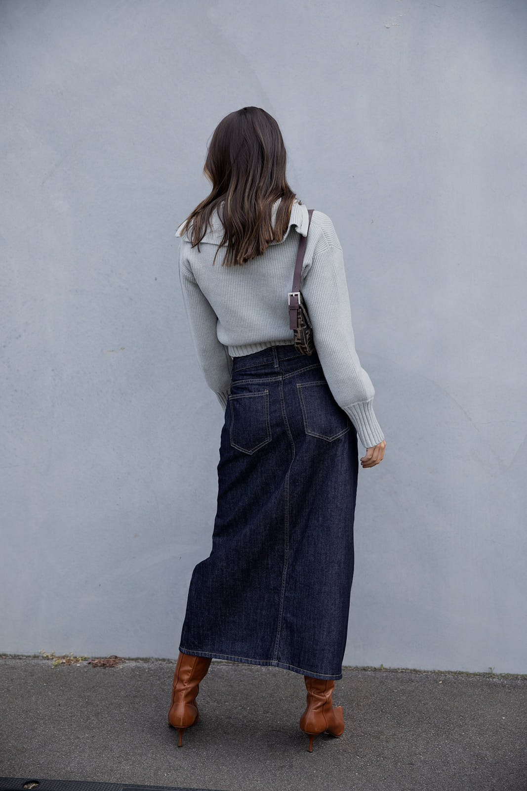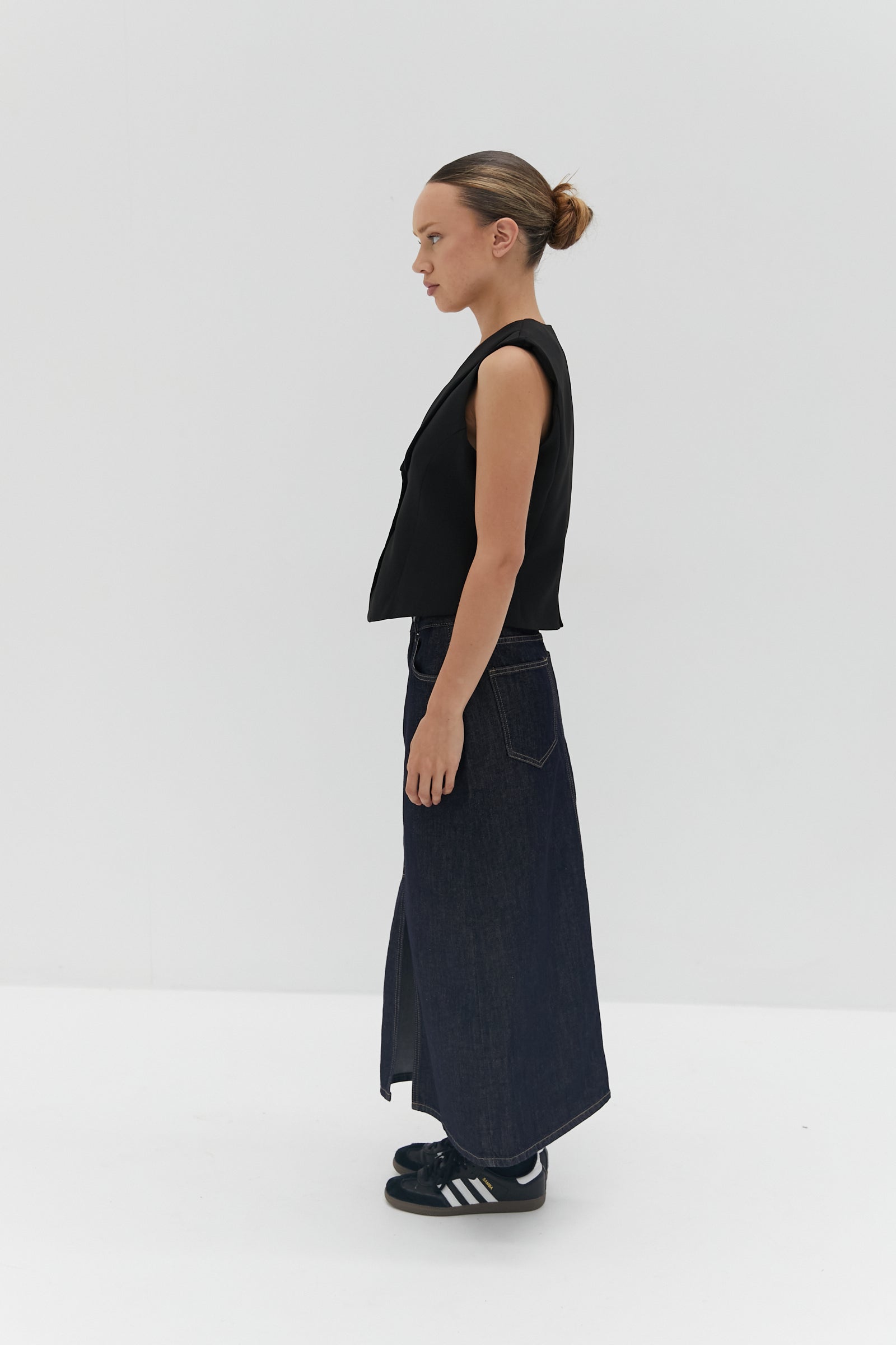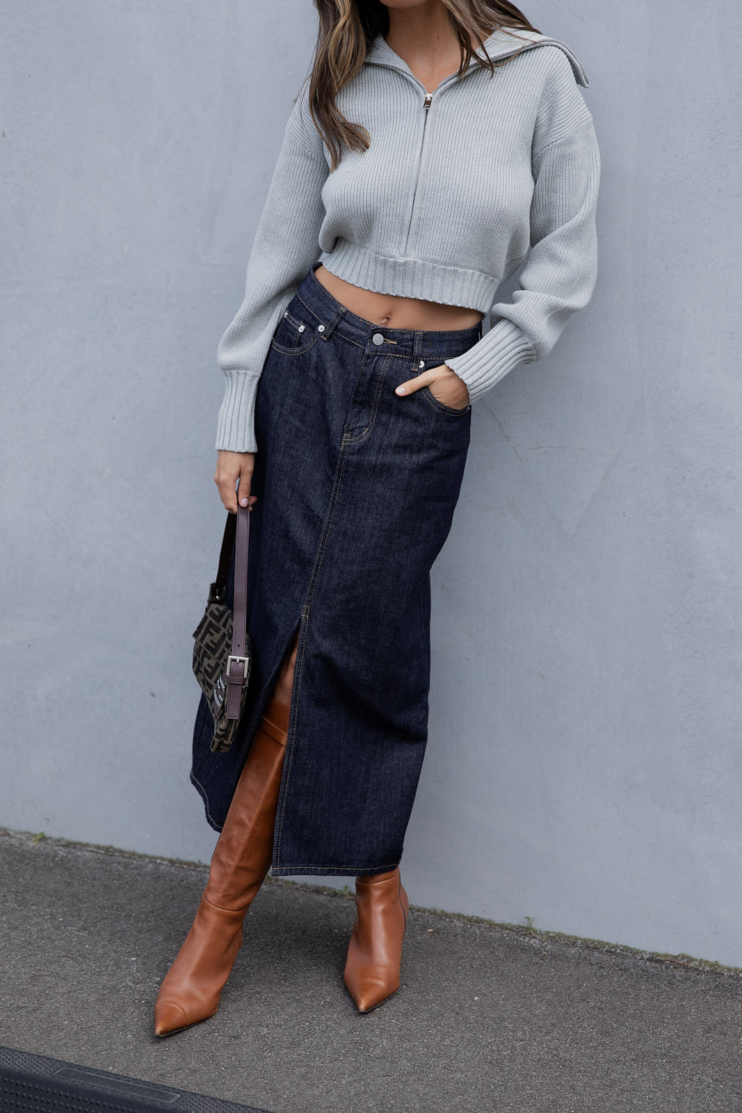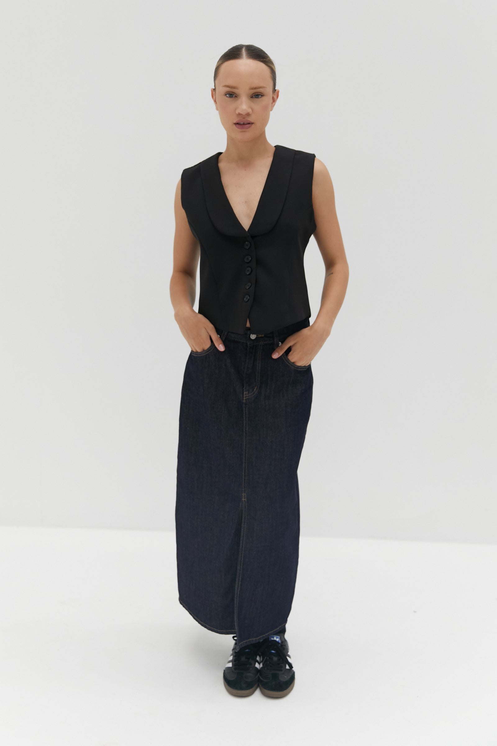 The Nikki Denim Midi Skirt - Dark Denim offers a versatile look across the seasons. Made from a comfortable cotton denim fabric, this mid-high waisted skirt features side and back pockets, belt loops, button front closure and a front split detail