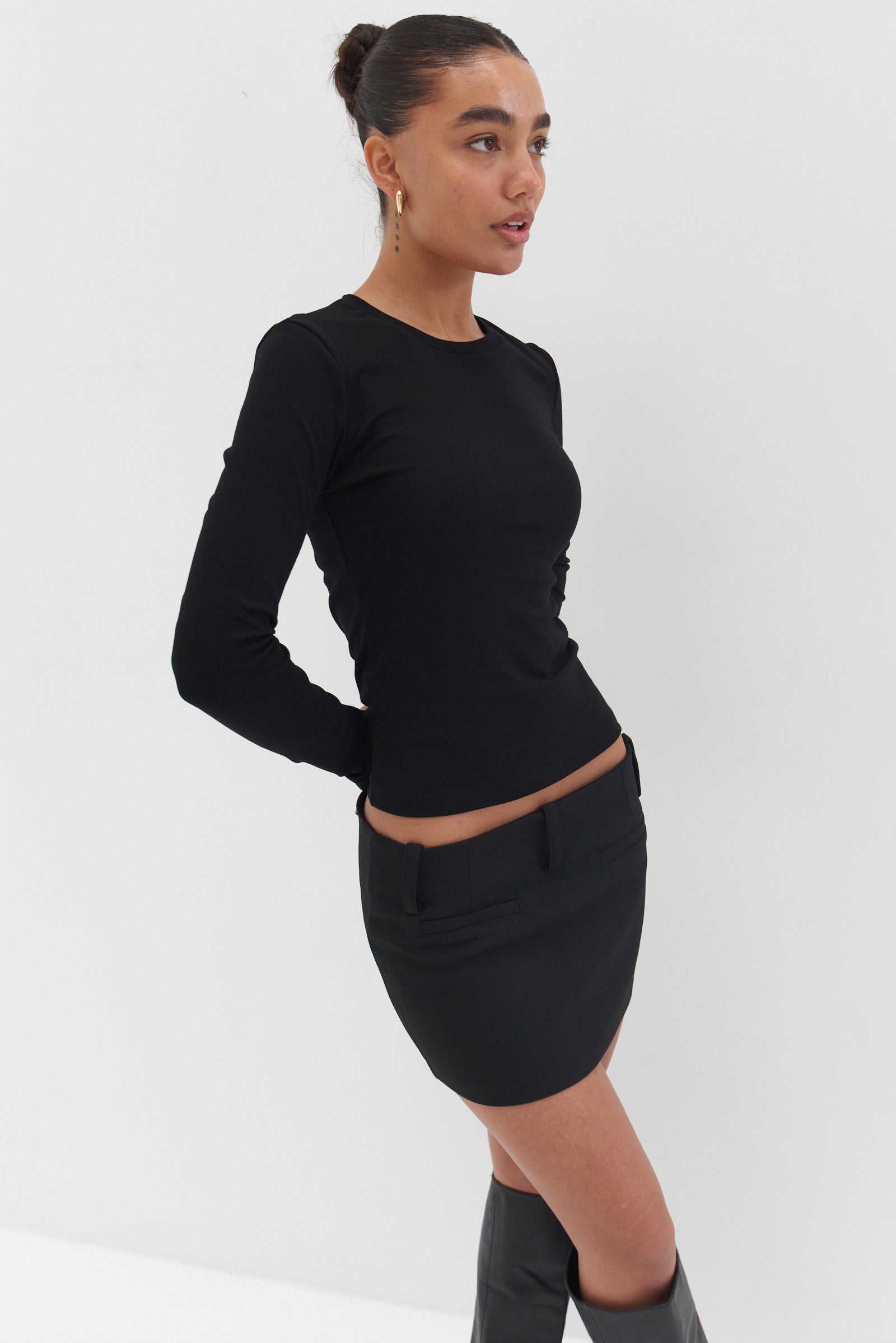 The Nora Mini Skirt is an ultra-chic must-have for any wardrobe. With its minimal micro mini cut, wide belt loops and faux front pockets, this skirt is the perfect little black mini