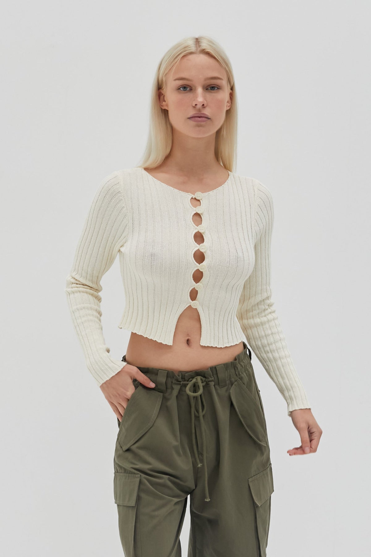 The Penelope Top with a medium weight knit and features front functional buttons, cropped length and long sleeves