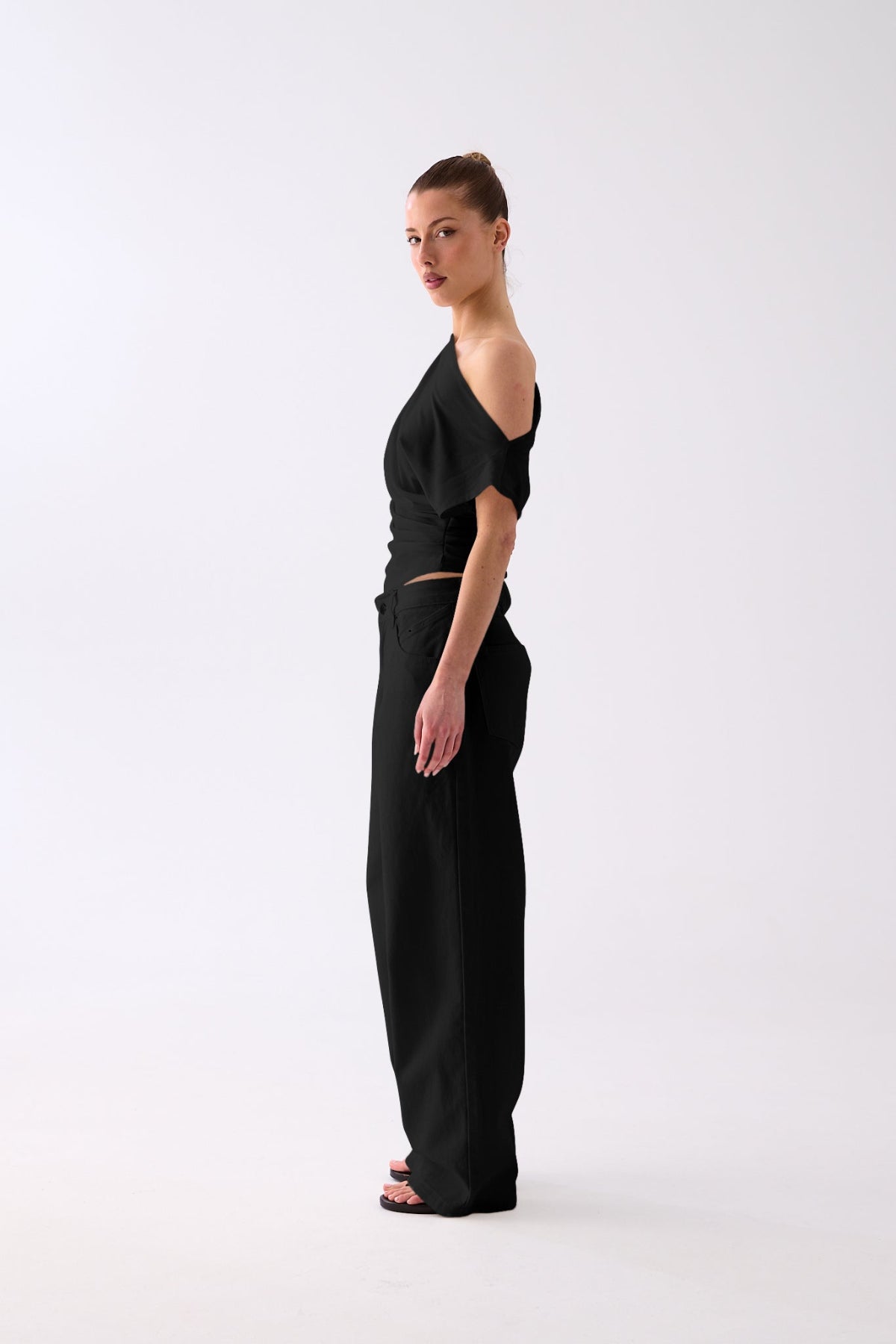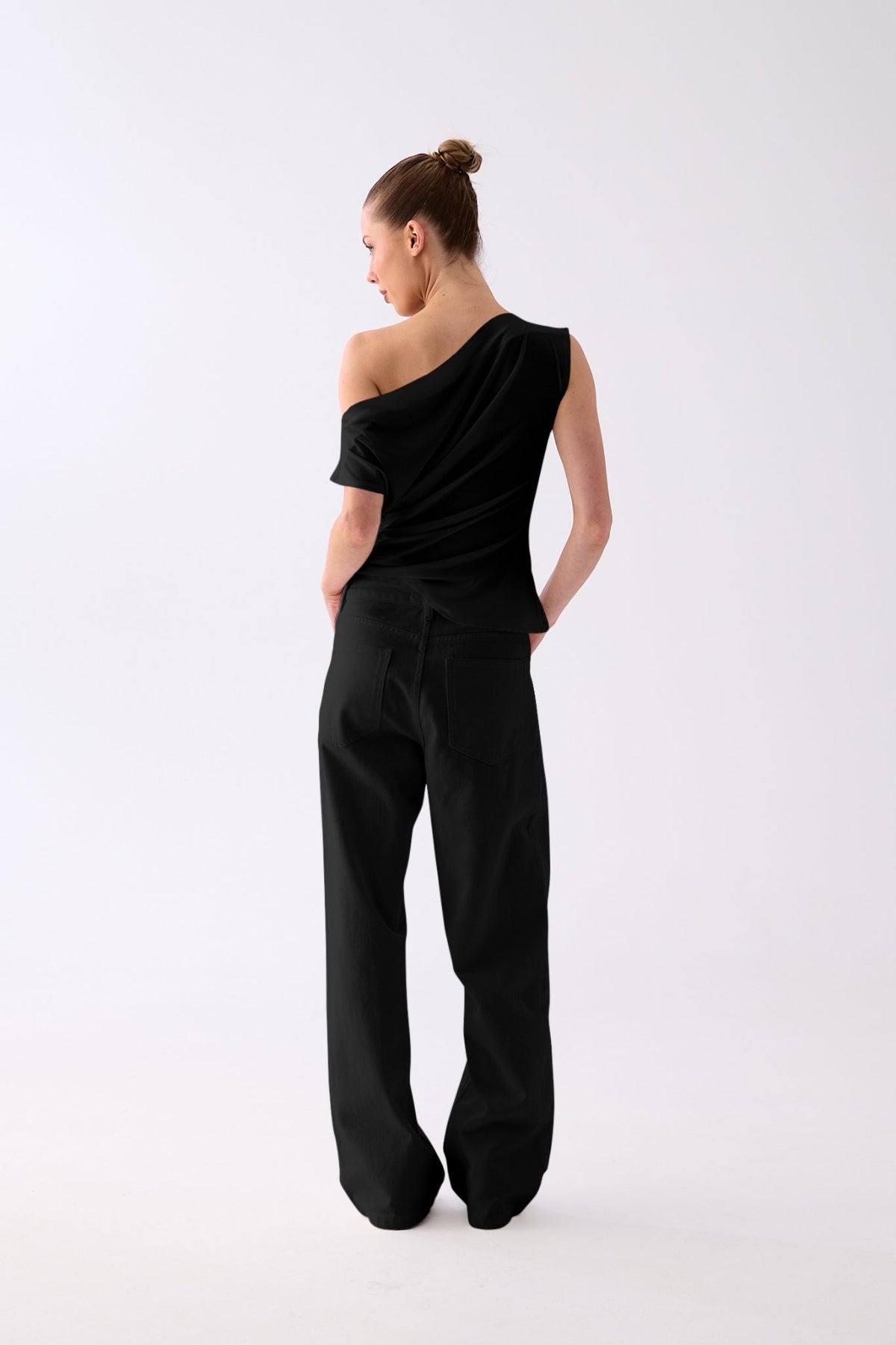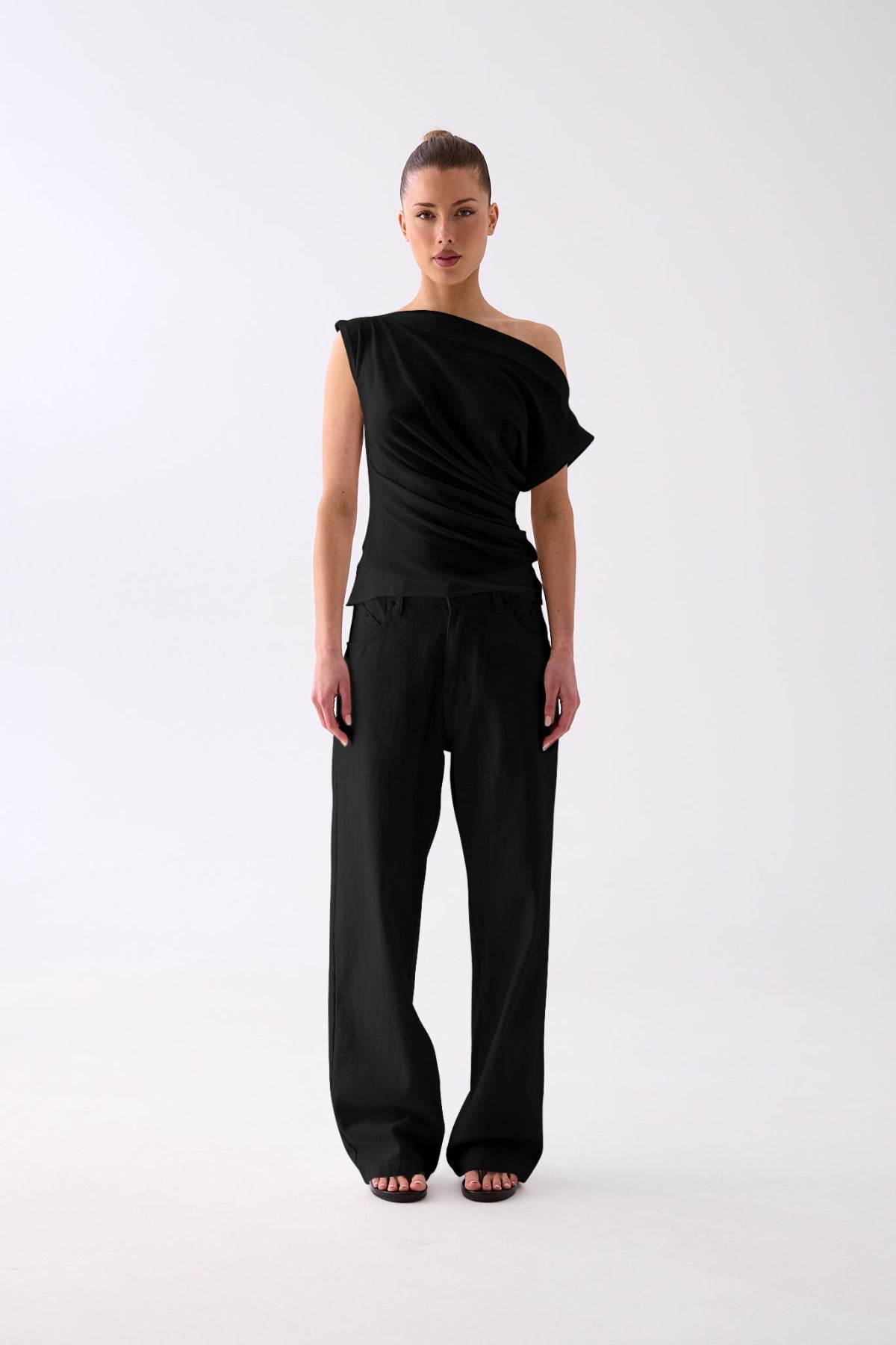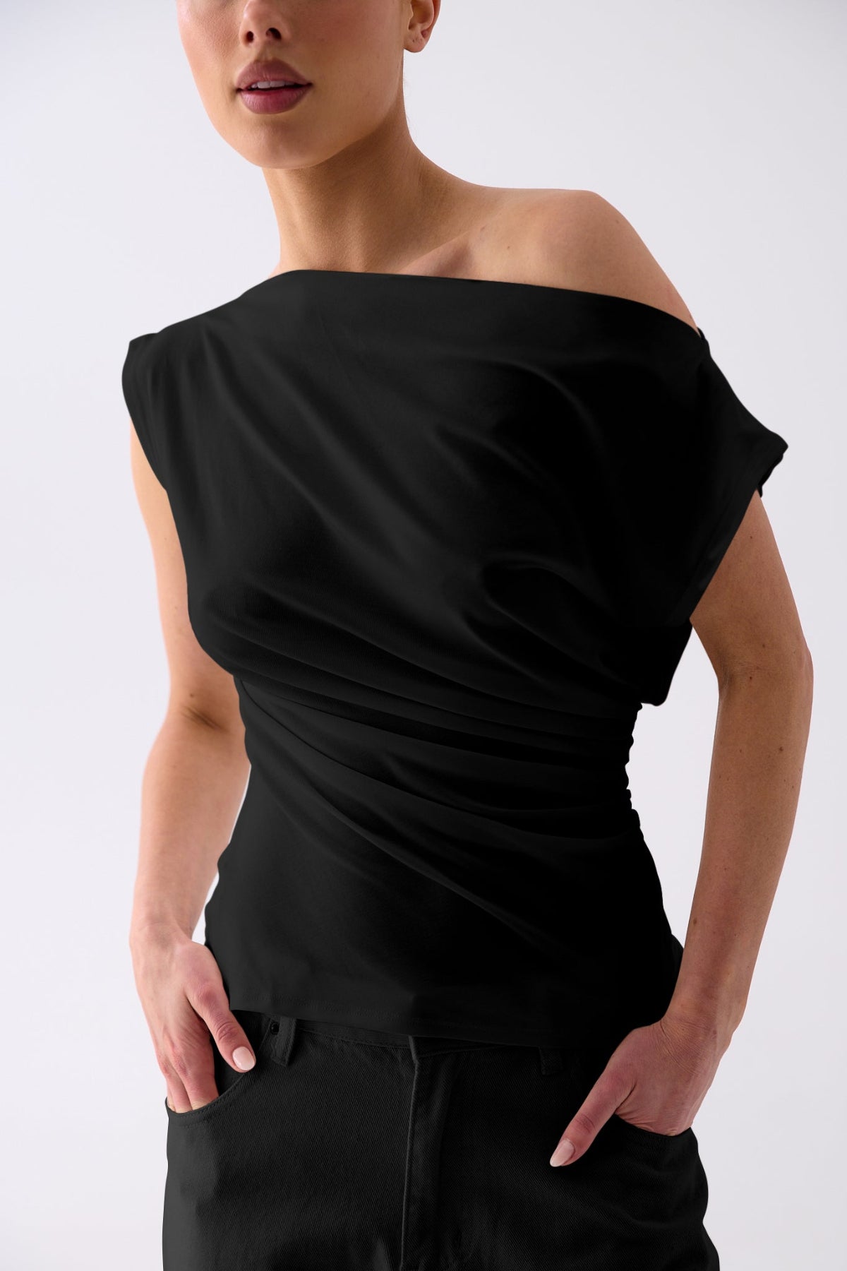 The Luna One-Shoulder Drape Top features a soft, fluid jersey that skims the body with subtle gathers for a flattering, sculpted silhouette. Designed with an asymmetric neckline and an easy, slip-on fit, it’s the perfect balance of modern and timeless. Style it with denim, tailored trousers, or a satin skirt for an understated yet refined finish.