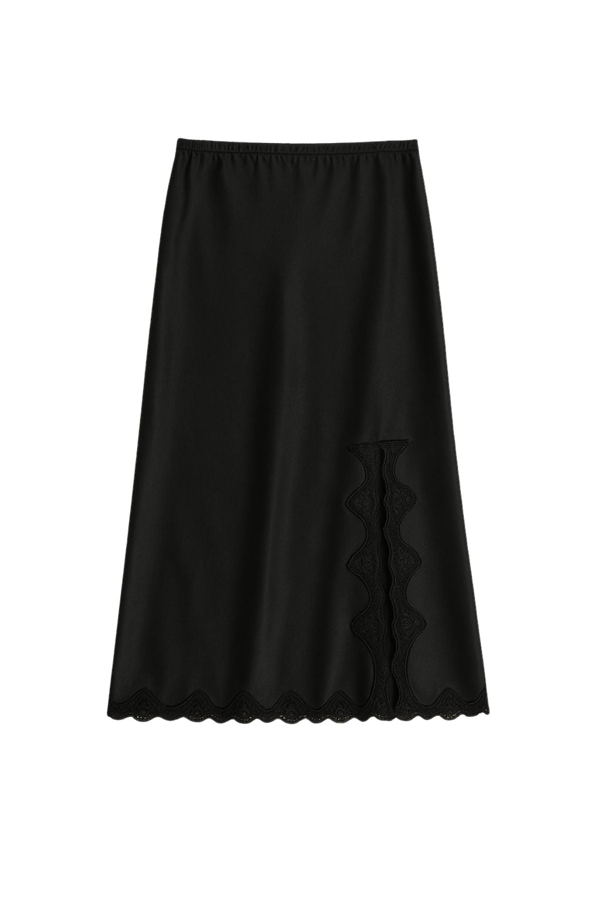 The Serena Satin Lace Trim Skirt is cut on the bias for a fluid drape that skims the body, finished with a delicate scalloped lace hem and side split for subtle texture and movement.