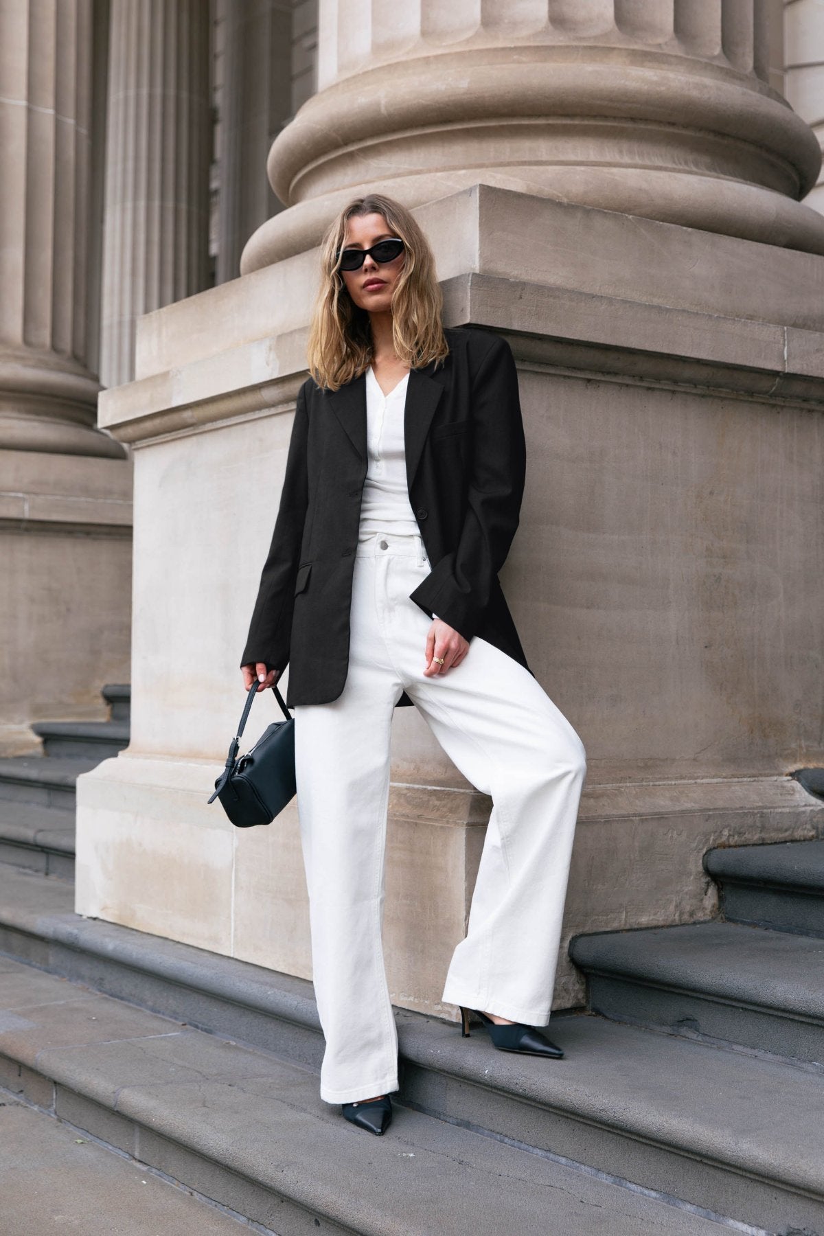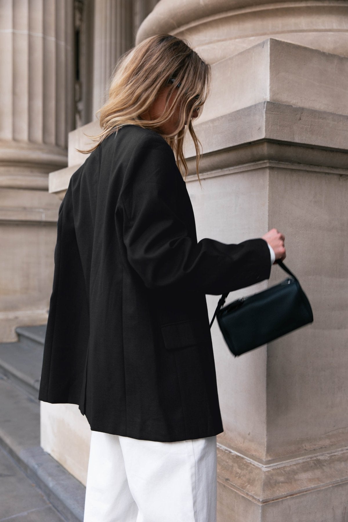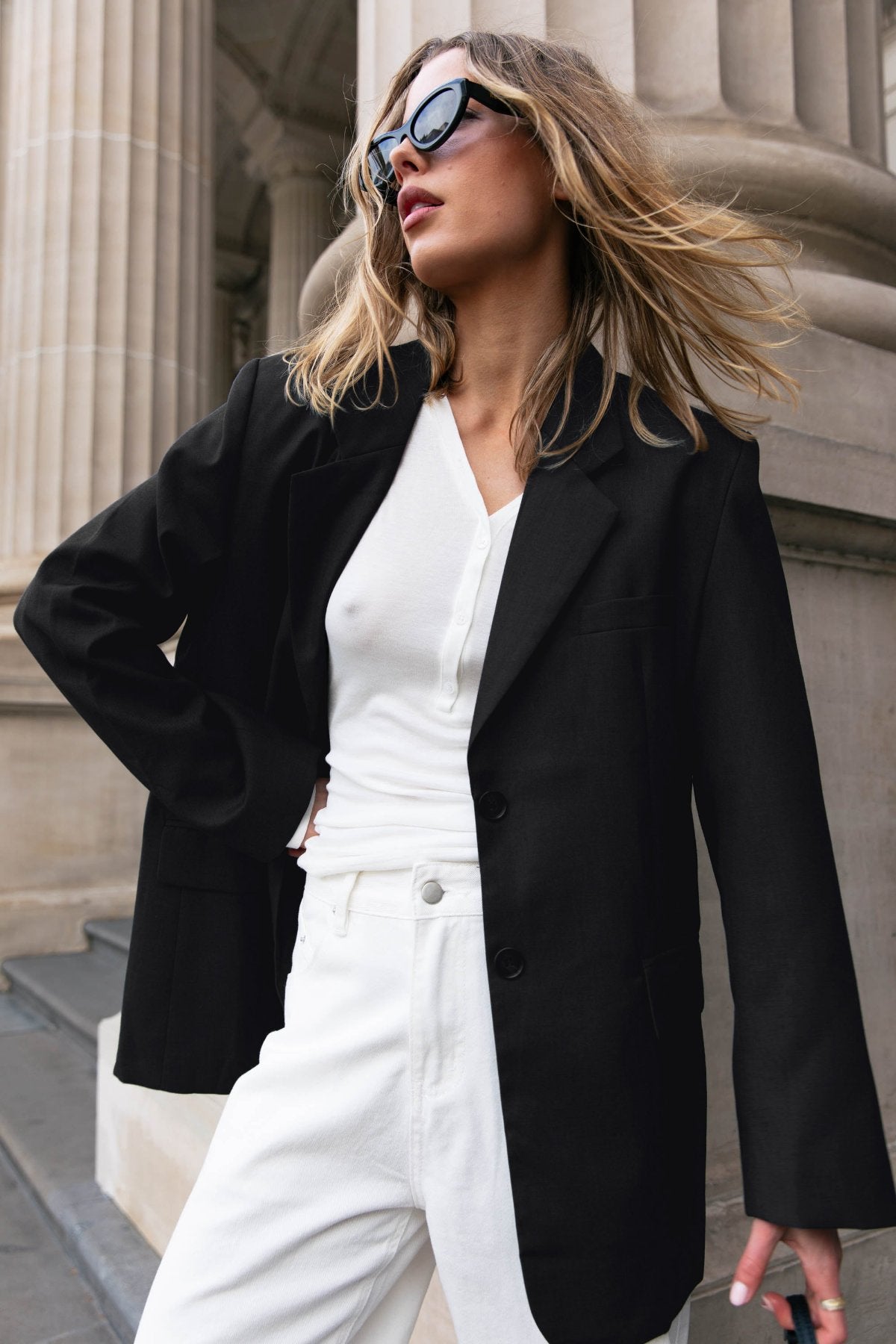 The Tailored Blazer in classic black features boxy silhouette, back vent, and slightly exaggerated shoulders for the perfect boyfriend blazer fit.