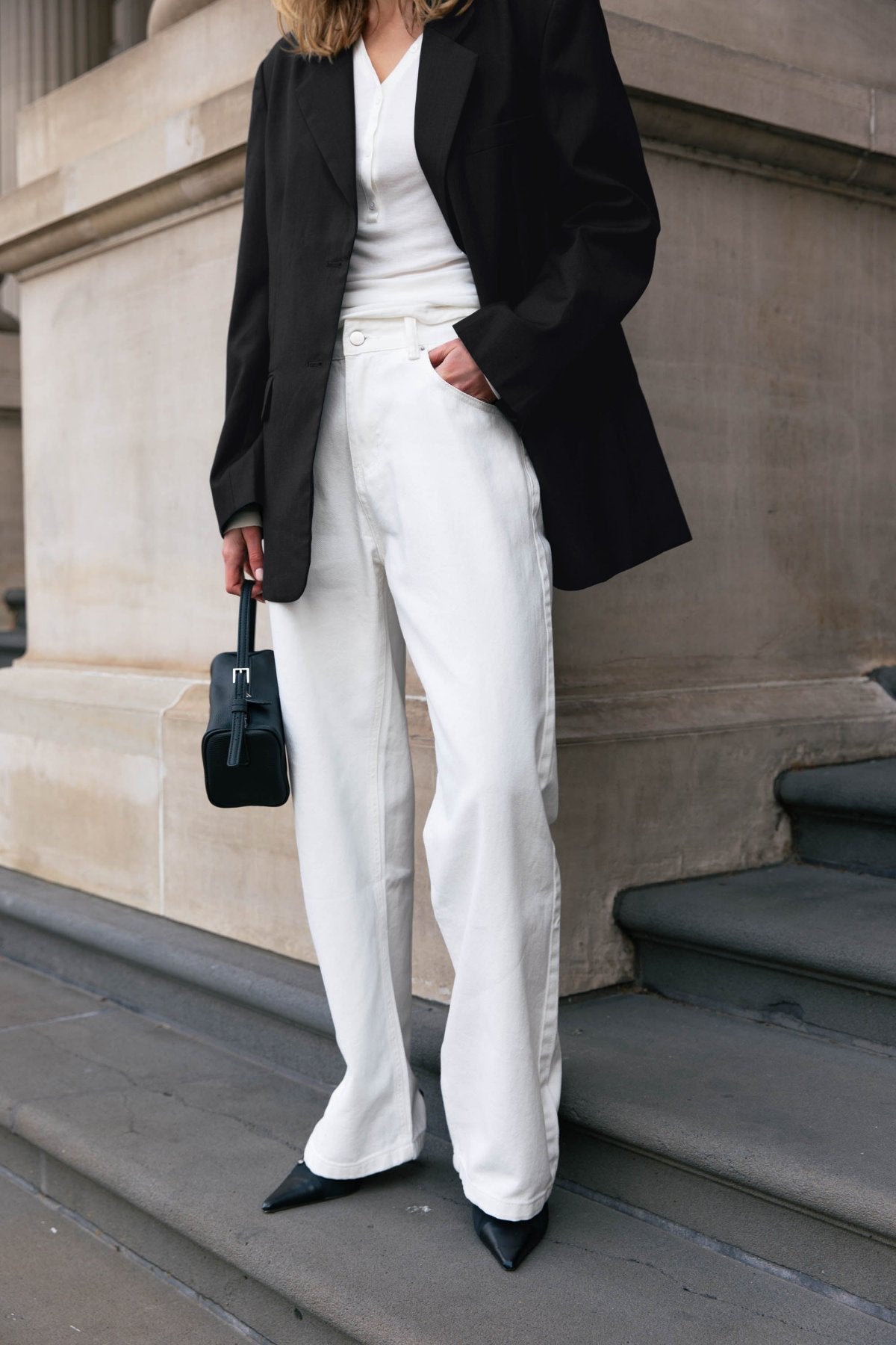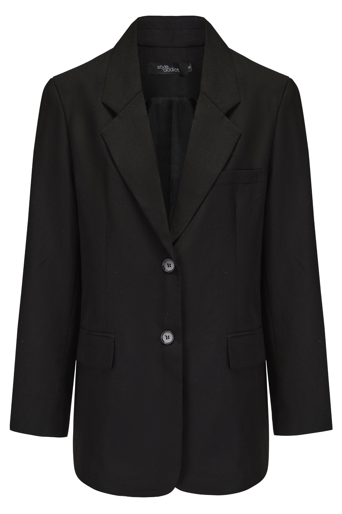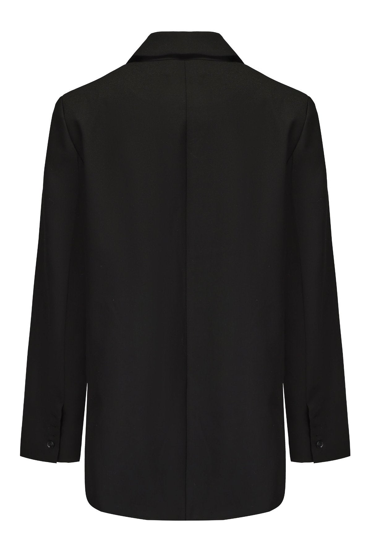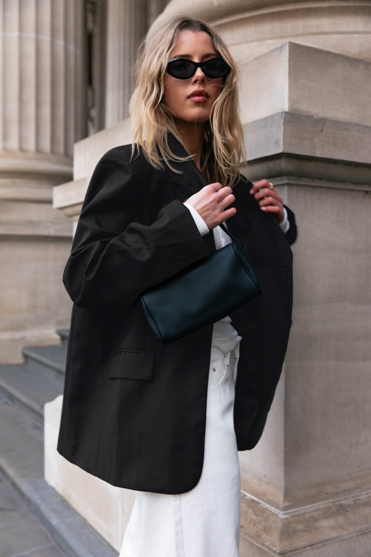 The Tailored Blazer in classic black features boxy silhouette, back vent, and slightly exaggerated shoulders for the perfect boyfriend blazer fit.