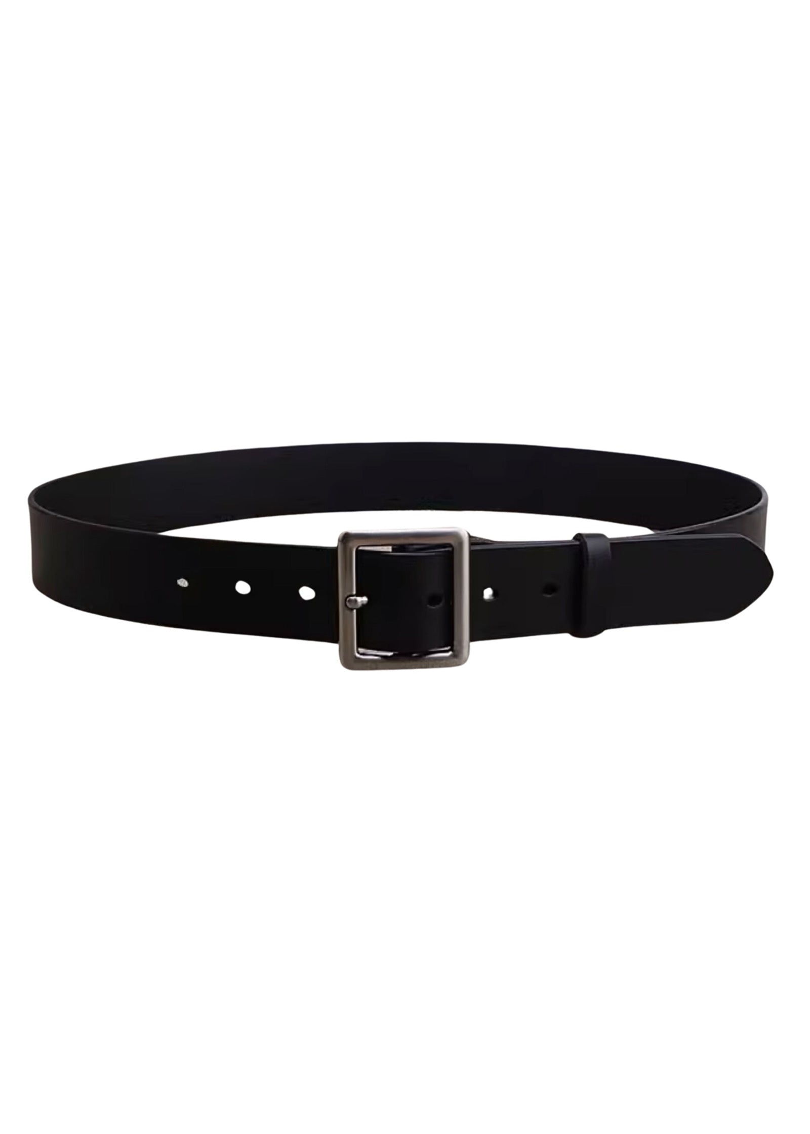 The classic Viktoria Belt features a square silver buckle and a black leather strap